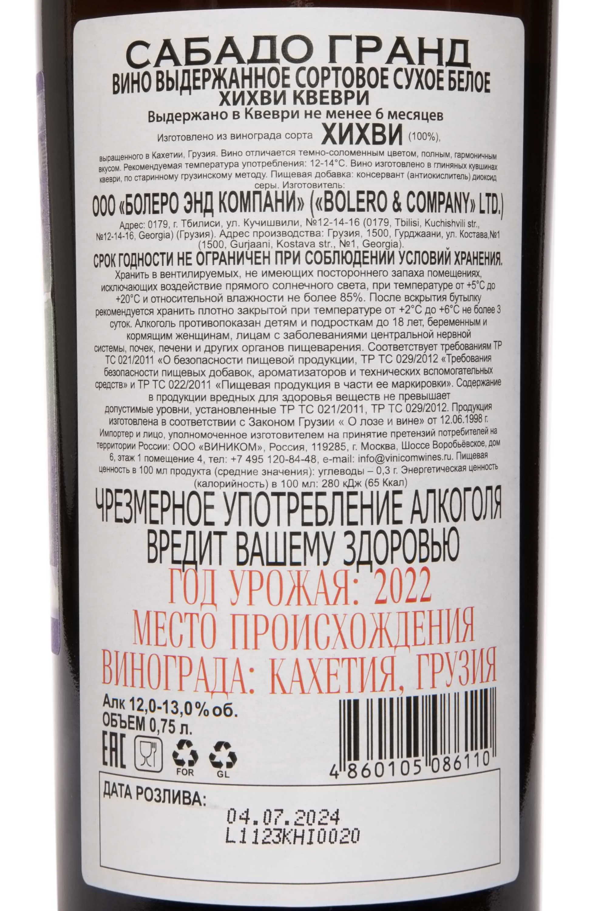 Sabado Grand Khikhvi Qvevri выпускается винодельней ООО «Болеро энд Компани» в регионе Кахетия. Основой вина служит автохтонный сорт Хихви, собранный вручную и обработанный по древней грузинской технологии с применением глиняных сосудов квеври. Особенность метода заключается в длительном брожении винограда вместе с мезгой в земле, благодаря чему вино приобретает насыщенность и сложность вкусовых нюансов, а также особенный оттенок. Выдержка в квеври помогает подчеркнуть индивидуальный характер сорта и традиции кахетинского виноделия, формируя аутентичный и многогранный напиток.