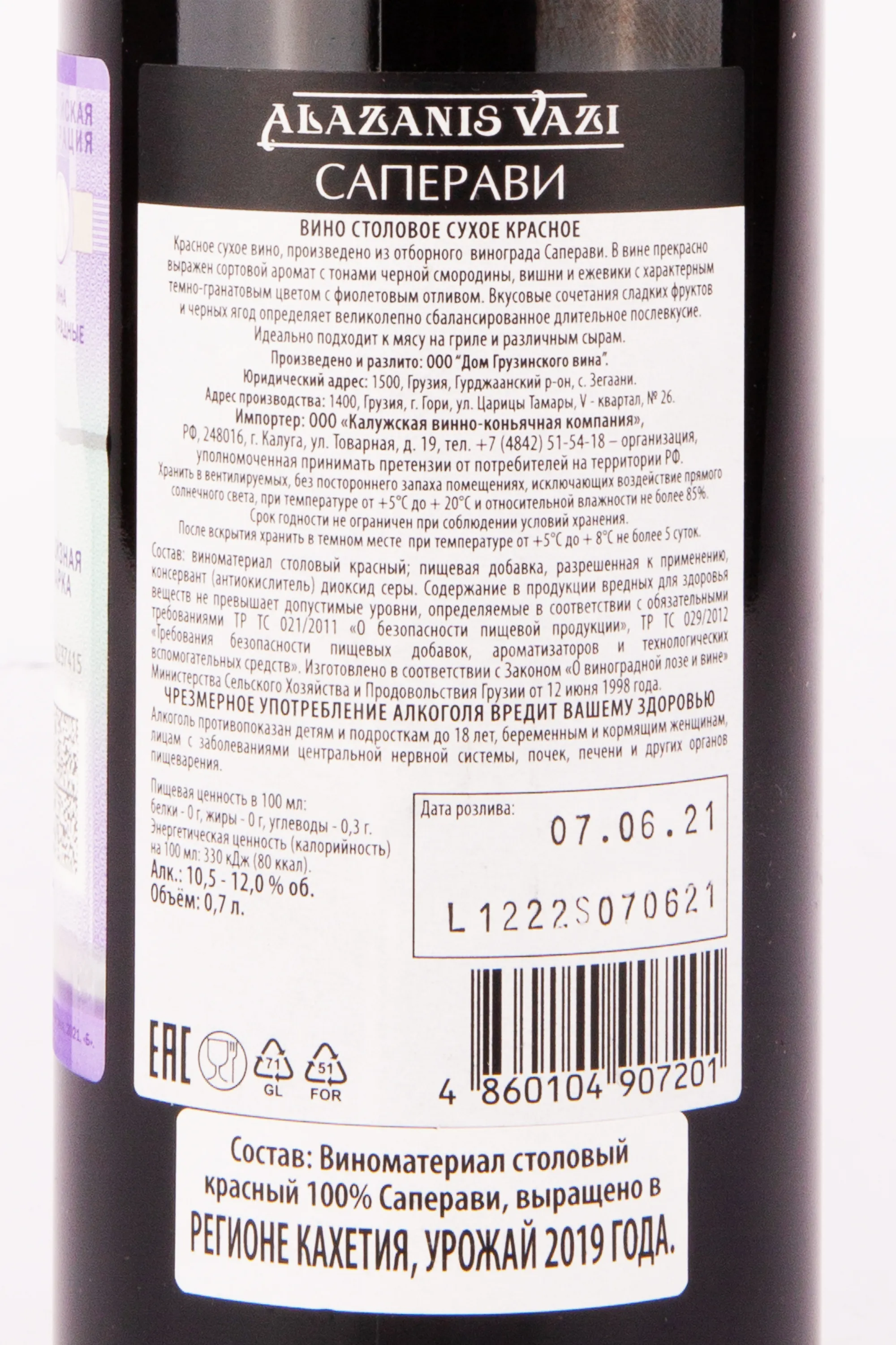 - Сорт виноград: Саперави (100%).
