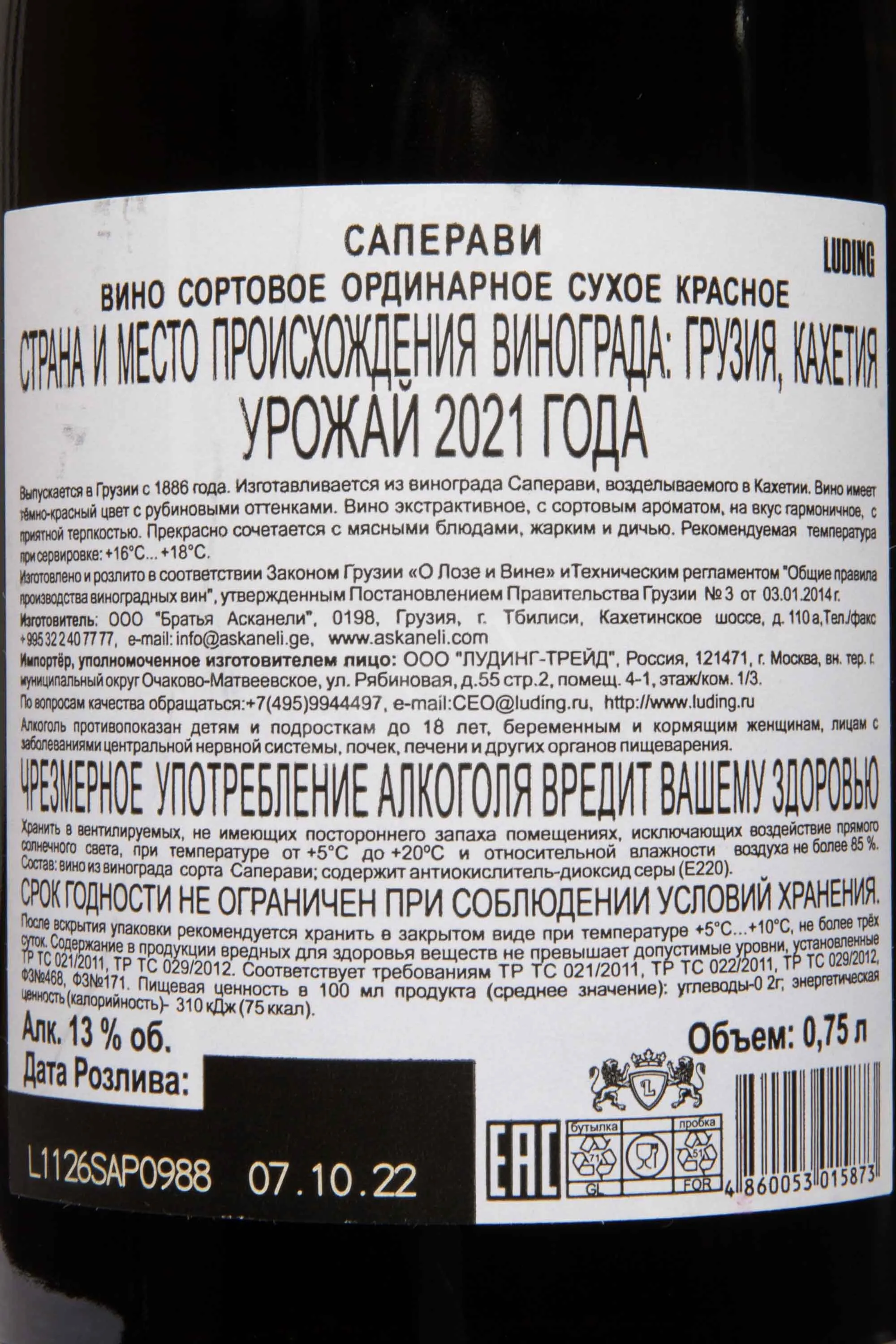 Красное сухое вино Saperavi Artwine 2019 г. с уровнем содержания алкоголя 12,5% является винтажным благодаря составу: в нем представлен виноград одного сезона урожая. Все стадии производства — от ручного сбора ягод до бутилирования — прошли в области Кахетия. В ходе изготовления сырье подверглось прессованию, мацерации и контролируемому окислению в стальных резервуарах. Богатый букет сформировала шестимесячная выдержка в ценных дубовых бочонках. Розлив осуществился в июне 2021 г.