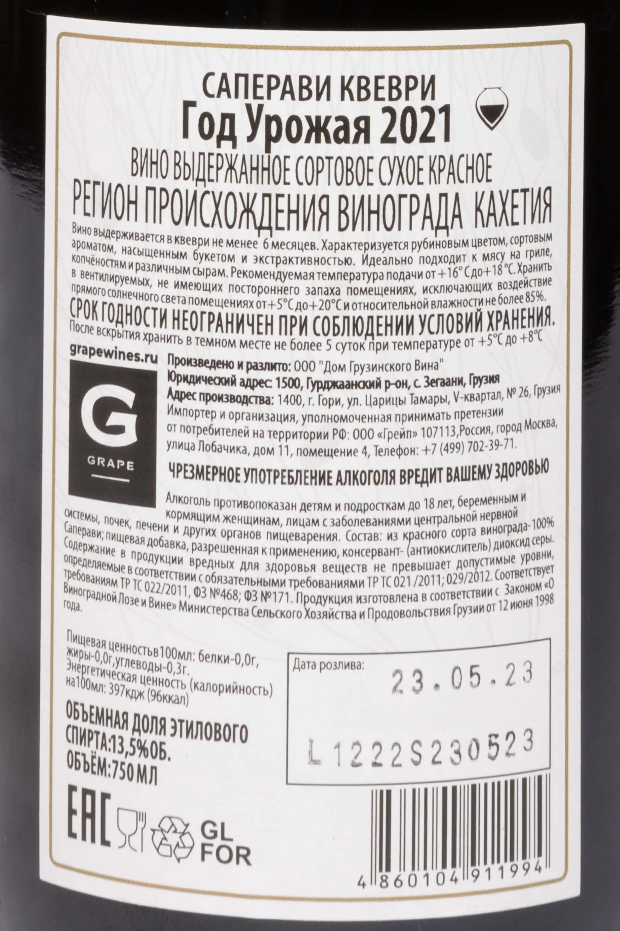 Вино Сангвине Саперави Квеври 0,75 л — алкоголь высокого качества, созданный по древней кахетинской технологии винификации, уходящей корнями в тысячелетнюю традицию Грузии. Производитель — ООО «Дом грузинского вина» — сохраняет подлинный дух ремесла, выдерживая спиртное в глиняных амфорах квеври, зарытых в землю для естественной терморегуляции и мягкого насыщения напитка кислородом. Виноград выращивается на солнечных склонах Кахетии, где глинисто-известковые почвы и контраст дневных и ночных температур способствуют формированию концентрированного вкуса и богатого аромата. Урожай собирается вручную, а брожение проходит на кожице, что придает вину насыщенность и устойчивую структуру. Результатом становится выразительное красное сухое вино, сочетающее силу и благородство с характерной минеральностью терруара.