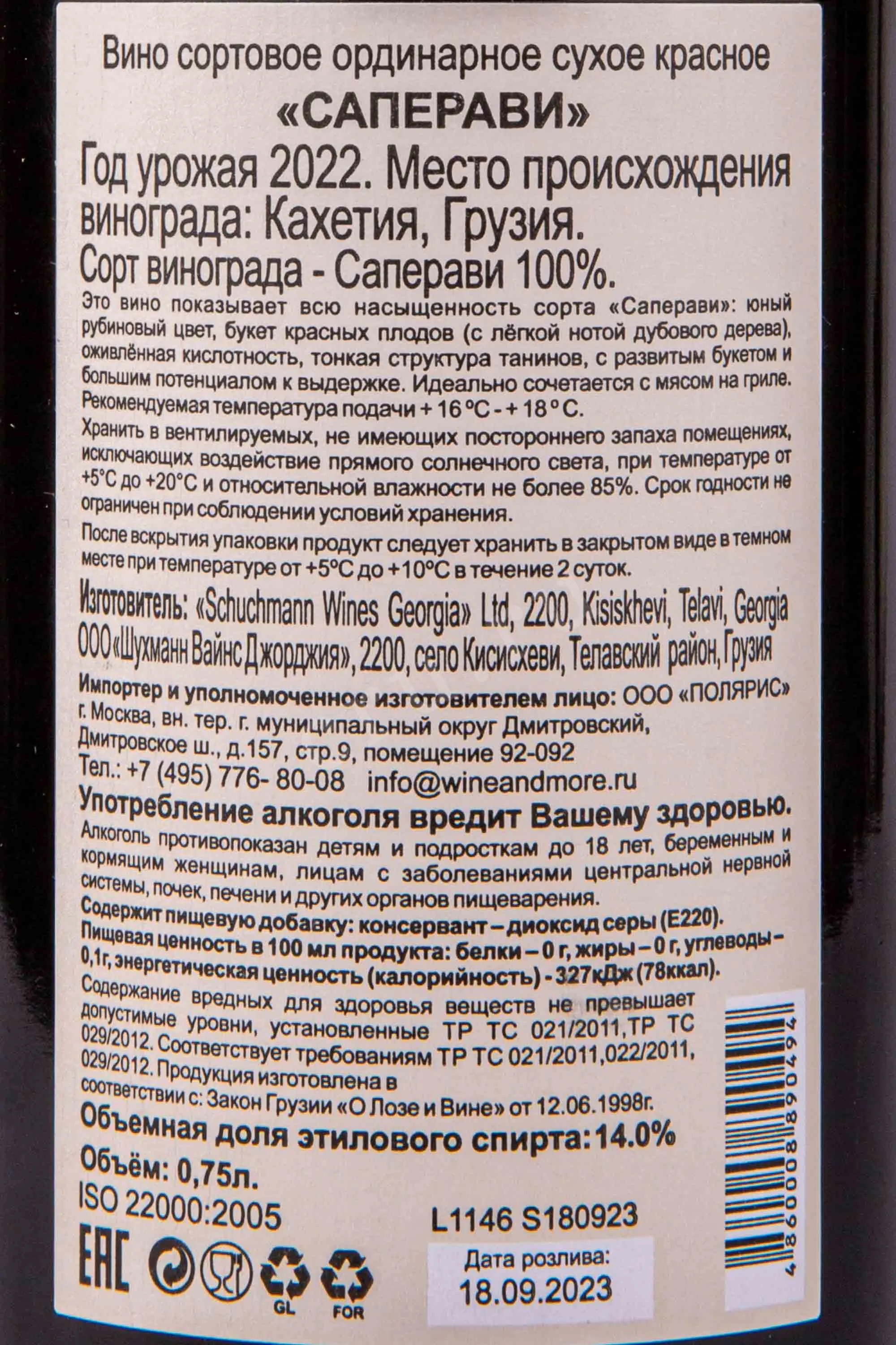 Красное сухое вино Schuchmann Saperavi 2022 года 0,75 л — яркое и выразительное, созданное из автохтонного сорта Саперави. Виноград растёт в тёплом и солнечном терруаре Кахетии с прохладными ночами, что помогает сохранить кислотность и аромат ягод. 2022 год был благоприятным: умеренные температуры и достаточное количество солнца обеспечили сбалансированное созревание ягод. Производство проходило в рамках современной технологии: ферментация и выдержка осуществлялись в нержавеющих ёмкостях, что позволило сохранить чистый фруктовый профиль и природную свежесть вина.