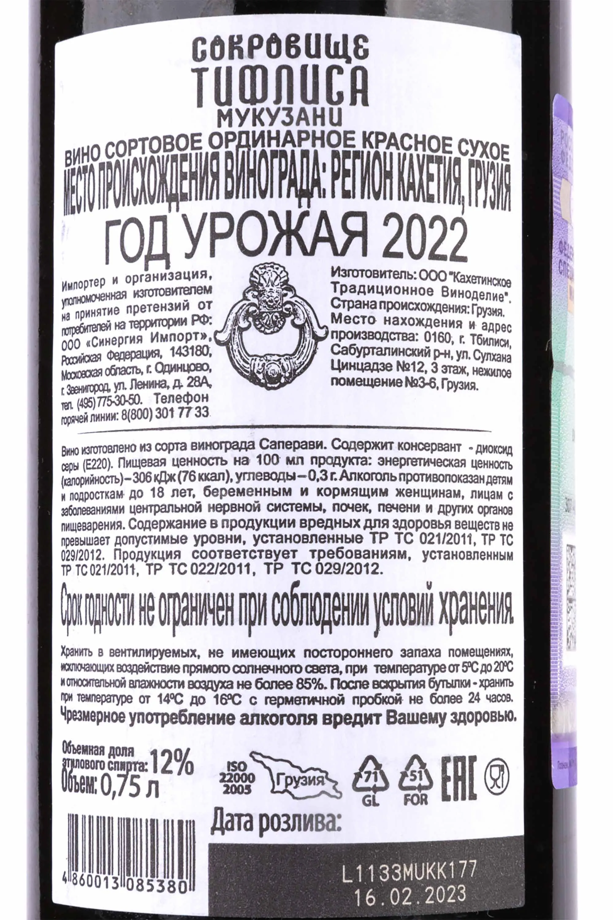 Вино Мукузани Сокровище Тифлиса 0,75 л создано мастерами винодельни «Кахетинское Традиционное Виноделие», которые бережно сохраняют древние традиции Кахетии. Производится красное сухое ординарное вино из автохтонного сорта винограда Саперави, собранного вручную в микрозоне Мукузани — одном из лучших терруаров региона. Плодородные почвы, теплый континентальный климат и щедрое солнце обеспечивают ягодам высокую концентрацию сахаров и глубокий вкус. После классического брожения сусло проходит выдержку в резервуарах из нержавеющей стали, что позволяет сохранить природную свежесть, насыщенность и сортовой характер. Напиток воплощает подлинный дух грузинского виноделия, отличаясь гармонией силы и элегантности.