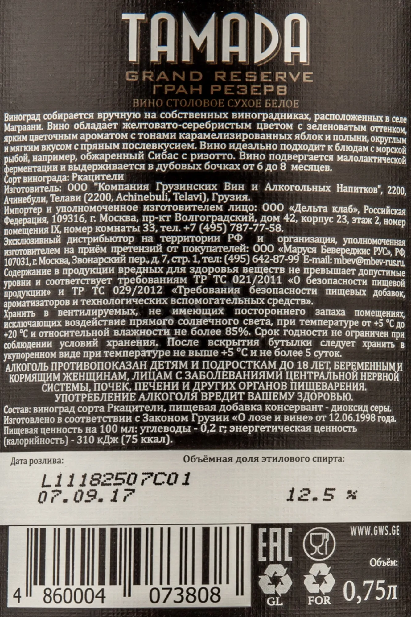 Вино Тамада Гран Резерв белое сухое 0,75 л — напиток, созданный по традициям грузинского виноделия с вниманием к каждой детали. Его происхождение связано с терруаром Кахетии, где виноград Ркацители впитывает тепло солнца и свежесть горных ветров. Урожай собирался вручную, ягоды подвергались мягкому прессованию для сохранения натуральной кислотности и аромата. Сусло прошло малолактическое брожение, что придало напитку мягкость и структурность. Выдержка в дубовых бочках длилась от шести до восьми месяцев, благодаря чему напиток приобрёл сбалансированную глубину, выразительный букет и элегантное послевкусие. Компания «Грузинских Вин и Алкогольных Напитков» при производстве уделила особое внимание гармонии между традиционными методами и современными технологиями, сохранив природный характер сорта и его минеральное звучание.