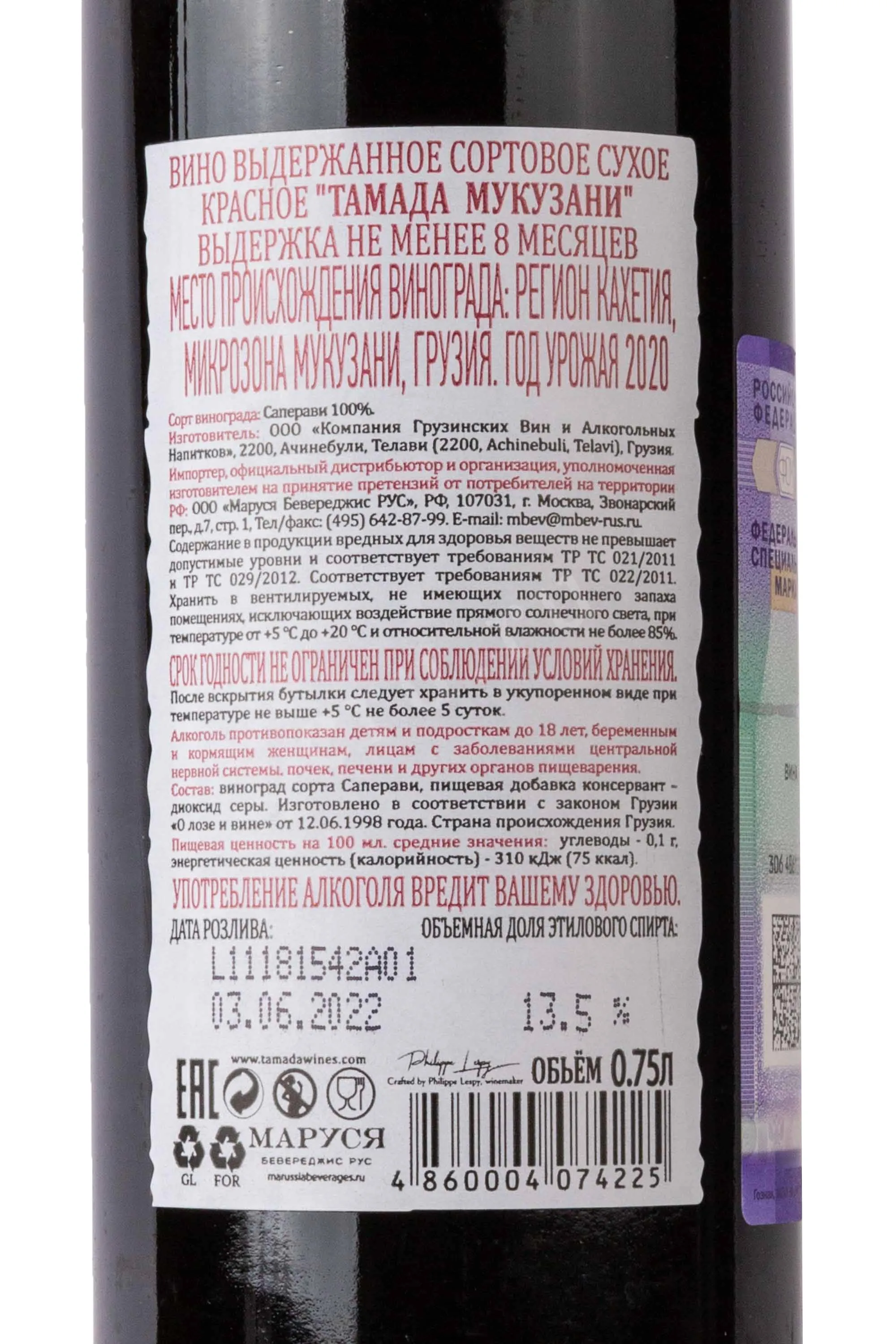 Красное сухое вино Tamada Mukuzani 2020 года 0,75 л обладает насыщенным и глубоким вкусом. Изготовлено из сорта Саперави, выращенного в микрозоне Мукузани в регионе Кахетия. Это зона с уникальным терруаром: тёплый климат, достаточное количество солнца и глинисто-известковые почвы. Виноград собирают вручную. Ферментация проходит в стальных чанах при контролируемой температуре. Затем вино выдерживают не менее 9 месяцев в дубовых бочках. Благодаря этому оно приобретает сложный вкус и гармоничную структуру.