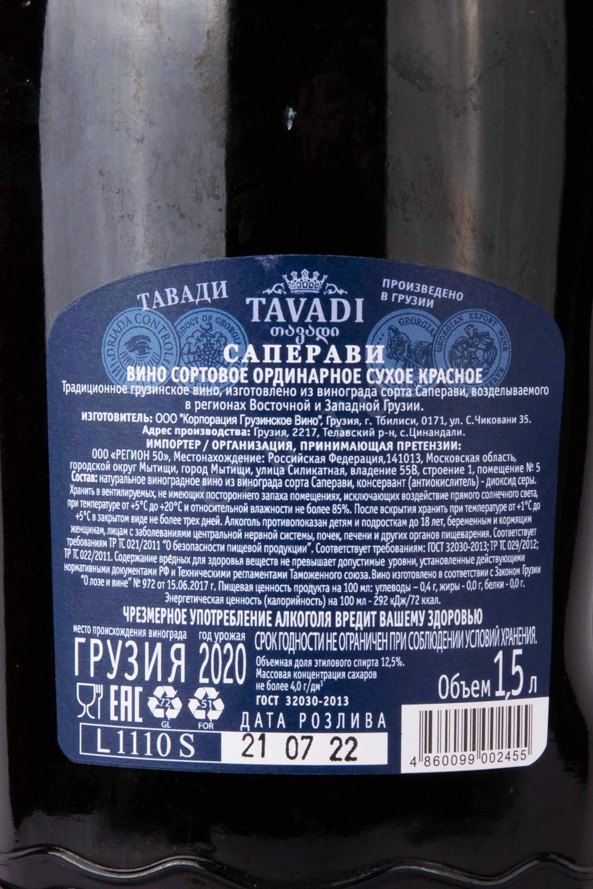 Вино красное сухое Тавади Саперави 1,5 л — произведение грузинского винодельческого искусства, воплощающее характер Кахетии и древние традиции региона. Этот напиток создаётся винодельней «Корпорация Грузинское вино», использующей классическую технологию мацерации на кожице с последующей выдержкой в дубе. Терруар характеризуется тёплым континентальным климатом, насыщенными железом и известняком почвами, благодаря чему ягоды сорта Саперави приобретают мощную структуру, глубину и природную насыщенность цвета. В бутылке объёмом 1,5 л отражена полнота аромата и вкуса — напиток буквально «дышит» грузинским солнцем, зрелыми плодами и винодельческой страстью, сохраняя при этом благородную сухость и сбалансированную кислотность.