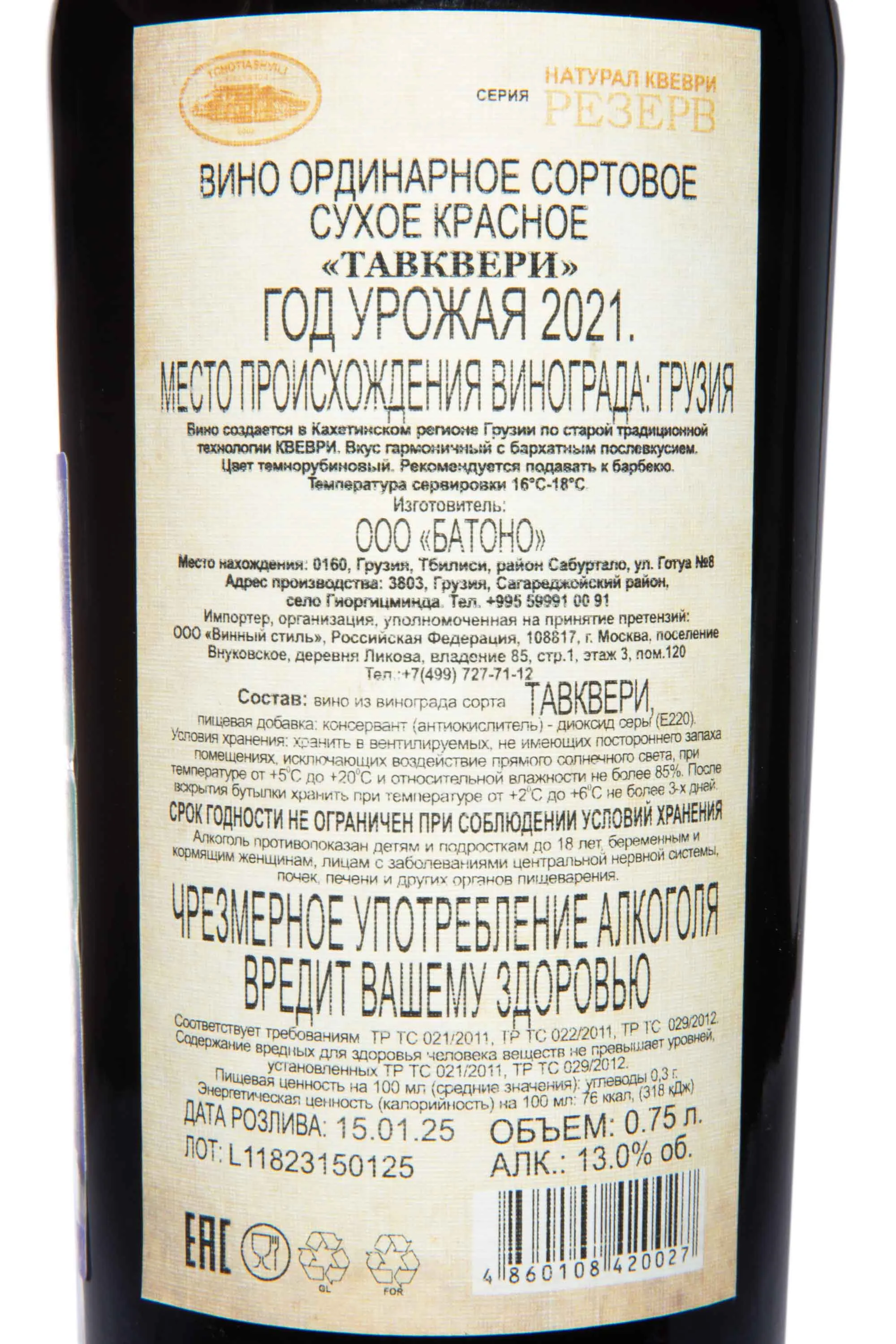 Красное сухое вино Tchotiashvili Tavkveri Natural Kvevri Reserve 2020 г. 0,75 л происходит из региона Кахетия, с виноградников в окрестностях Телави. Лозы здесь растут на холмистых участках с умеренным уклоном. Почвы содержат глинисто-известняковые слои и мелкую гальку, что способствует насыщенному вкусу будущих напитков. Производитель придерживается естественных методов виноградарства, не используя синтетические удобрения и пестициды. Урожай 2020 года прошел под знаком мягкой зимы и теплой весны, с осадками около 650 мм в год. Это обеспечило равномерное вызревание ягод и стабильную кислотность. Длина вегетационного периода составила около 180-190 дней, поэтому плоды успели накопить достаточное количество сахара. Собранный вручную виноград ферментировали в квеври – традиционных глиняных сосудах. Там сусло бродило вместе с мезгой, приобретая выраженный характер и глубокий аромат. Процесс мацерации длился несколько месяцев, после чего вино созревало без добавок, сохраняющих естественный цвет и запах. Итоговый объем разлива в этой линейке ограничен несколькими тысячами экземпляров, каждый из которых отражает специфику местного терруара.