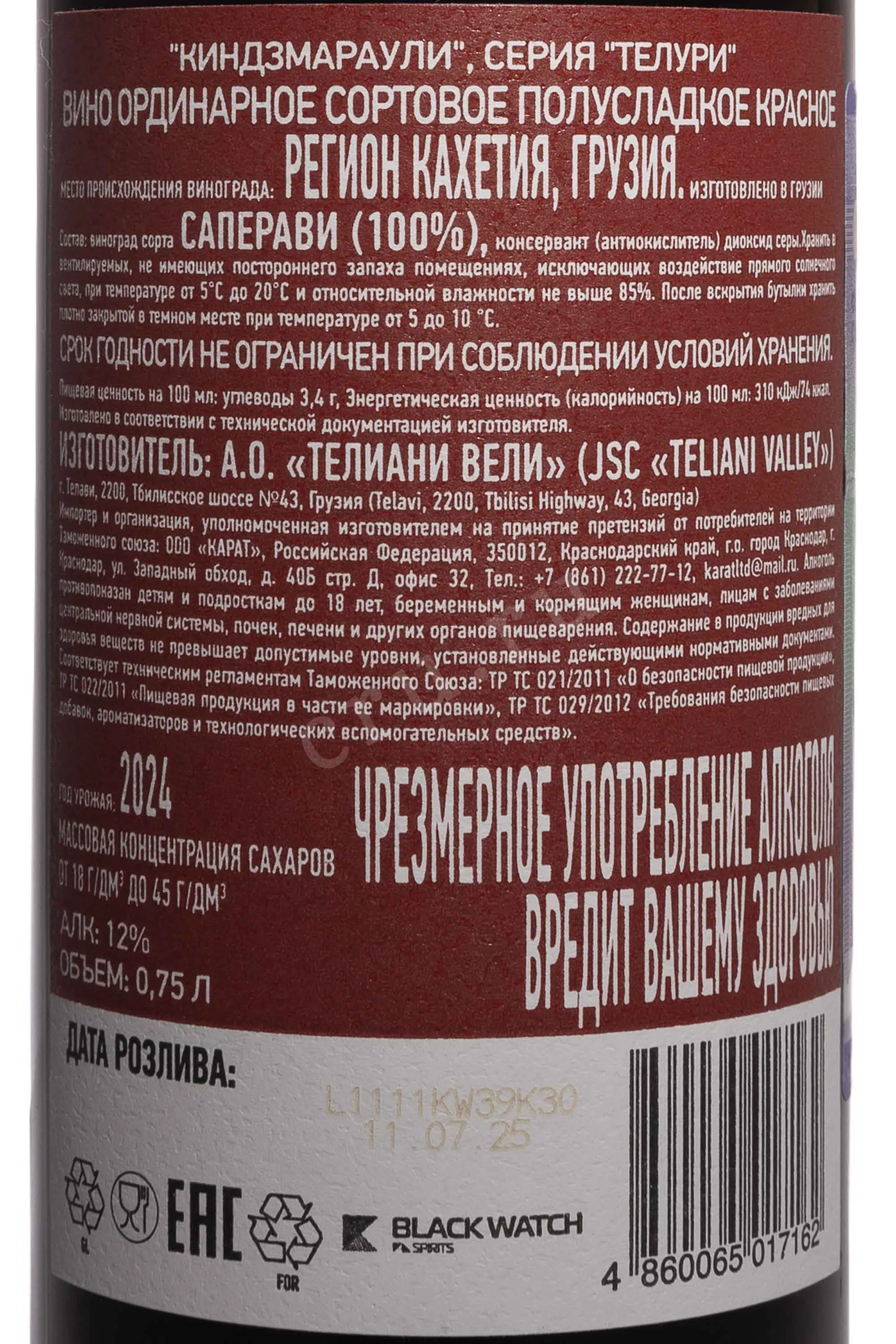Вино Телури Киндзмараули 0,75 л — алкоголь высокого качества, созданный в винодельческой зоне Кахетии, где мягкий климат и плодородные почвы создают идеальные условия для выращивания красных автохтонных сортов. Производится хозяйством Телиани Вэлли по категории ЗГУ «Киндзмараули», что гарантирует соблюдение традиций региона и высокие стандарты качества. Виноград выращен на солнечных склонах долины реки Алазани, где глинисто-галечные почвы придают ягодам насыщенность и глубину вкуса. После бережного ручного сбора ягоды проходят холодную мацерацию, благодаря чему сохраняются естественные ароматические вещества и характерная мягкость танинов. Медленное брожение при контролируемой температуре и последующая выдержка позволяют достичь гармоничного баланса между природной сладостью и освежающей кислотностью.