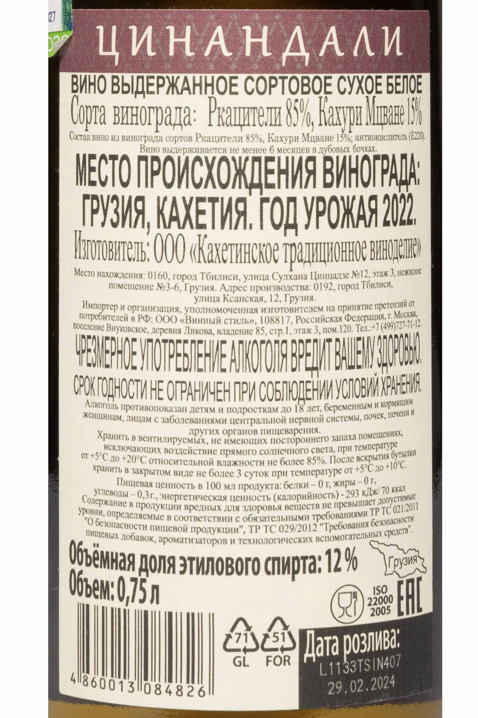 Вино Сердце Арагви Цинандали 0,75 л производят в центральной части Кахетии — региона, где издавна формировались винодельческие традиции Грузии. Производитель «Сердце Арагви» использует автохтонные сорта Ркацители и Мцвиване Кахури, выращенные на солнечных склонах долины Алазани. Здесь почвы богаты известняком и галькой, а континентальный климат с резкими суточными перепадами температур придает ягодам выразительную кислотность и насыщенный аромат. После бережного сбора ягоды проходят мягкое прессование, сусло сбраживается при контролируемой температуре, что позволяет сохранить природную свежесть и фруктовую палитру сортов. Напиток выдерживается в нержавеющих резервуарах, где его вкус становится гармоничным и сбалансированным. Этот стиль подчеркивает характер Цинандали — изящного, но выразительного вина, вобравшего дух грузинского терруара.