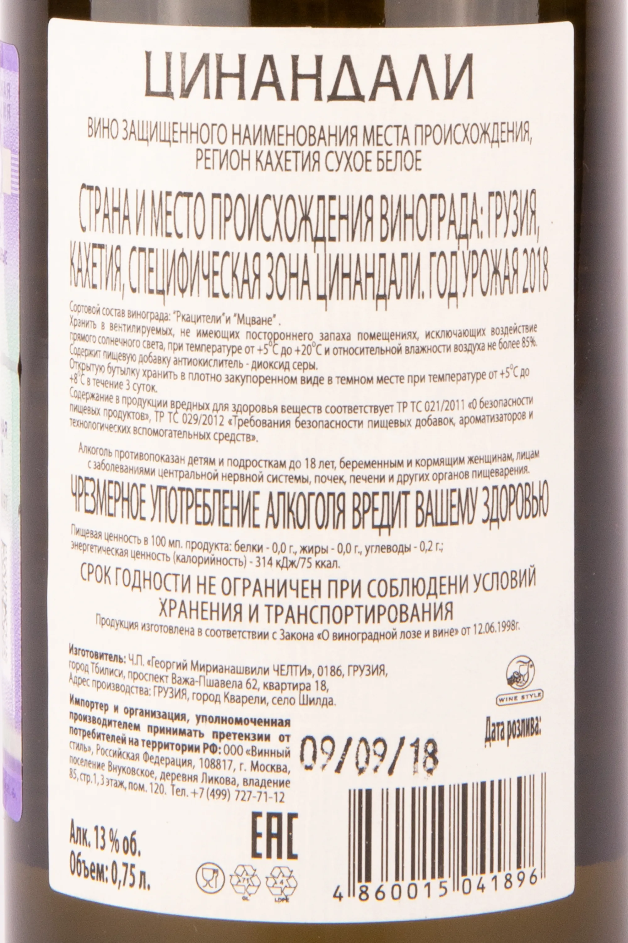 Вино Tsinandali Chelti Estate 0.75 л – белая вариация сухого сорта от грузинского производителя защищенного наименования места происхождения (регион Кахетия), изготовленная из двух сортов винограда, выращенного в особой микрозоне Цинандали. Ягоды собирают в момент оптимальной зрелости, освобождают от гребней и слегка отжимают. Полученное сусло винифицируют традиционным методом в стальных цистернах при температурном контроле 26-28 градусов. Вино снимают с осадка с помощью мембранных фильтров и бутилируют.