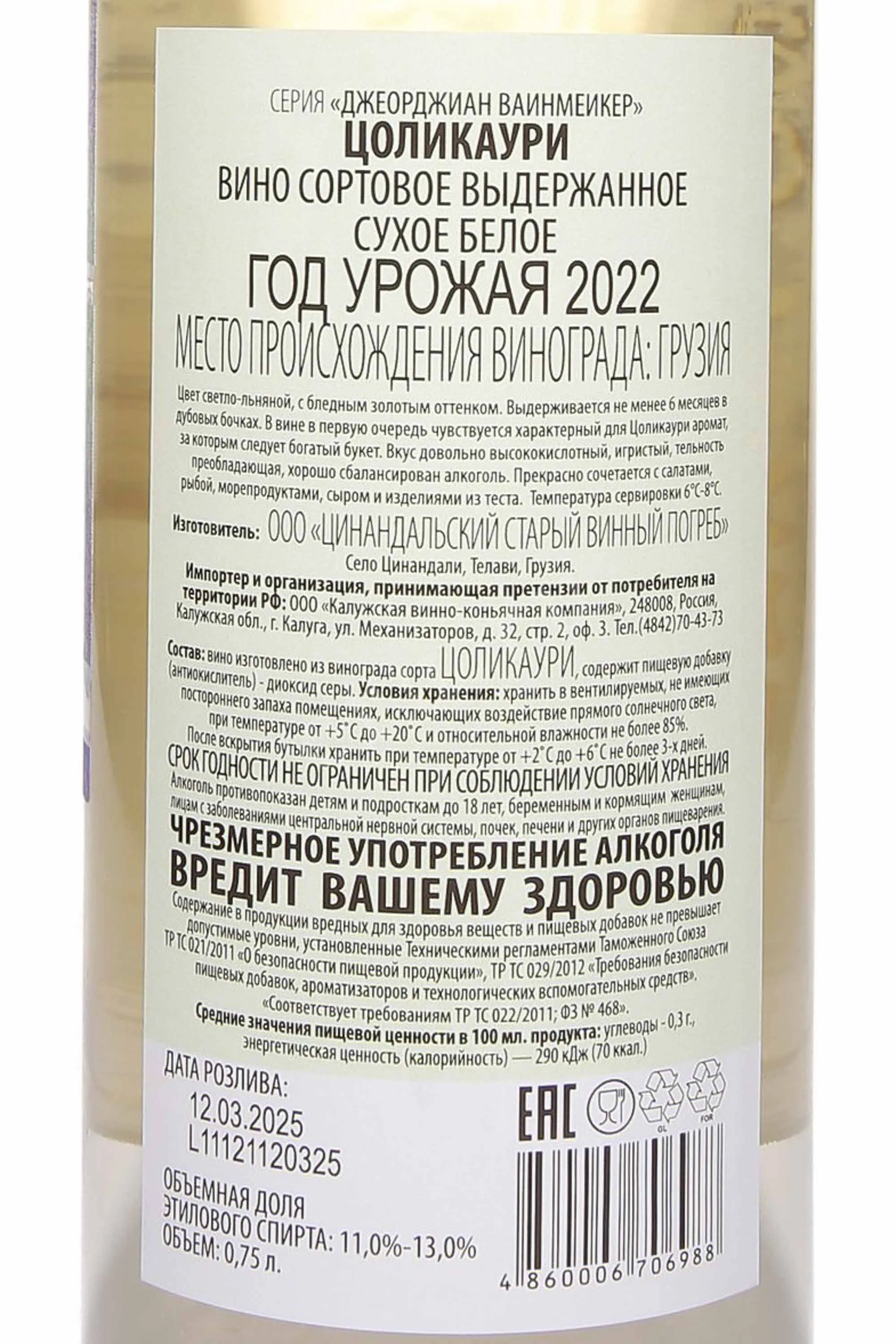 Georgian Winemaker Tsolikauri представлено компанией ООО «Цинандальский Старый Винный Погреб» из грузинского села Цинандали. Виноград белого автохтонного сорта Цоликоури выращивают в живописном регионе Имерети, где местами виноградники достигают высоты 1300 метров над уровнем моря. Сорт славится многофункциональностью, он подходит для создания сухих, полусладких (Твиши), игристых вин, а также традиционной ароматной чачи. Данный образец является ярким примером сухого белого вина, раскрывающего уникальные характеристики высокогорного терруара и сортовой индивидуальности Цоликоури.
