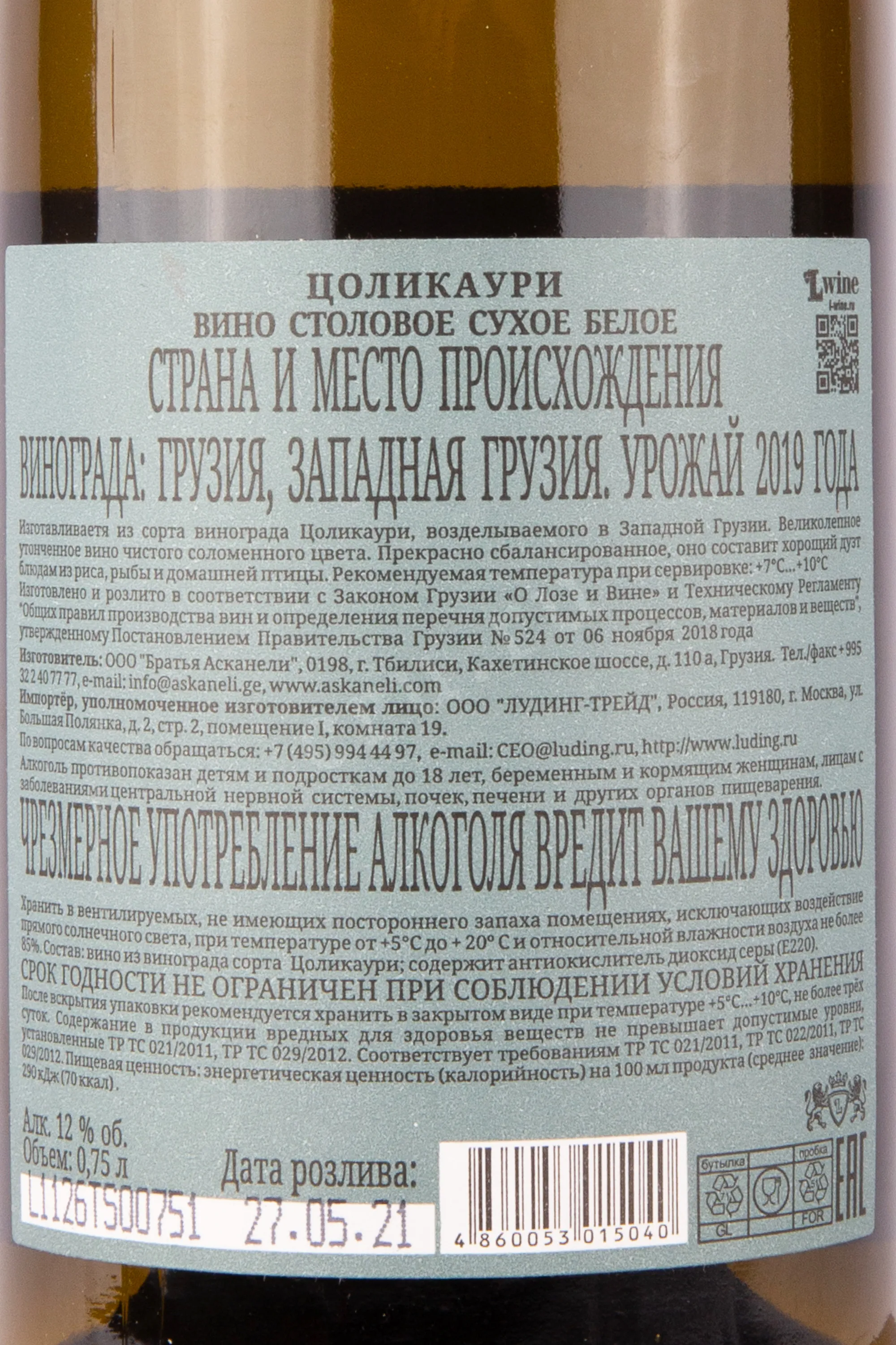 Белое сухое вино Tsolikouri Askaneli Author`s Collection 2019 г. — 12-градусный винтаж высокого качества, изготовленный в западной части Грузии из автохтонного сорта винограда, который бережно собрали в спелом виде на протяжении одного года. Сусло, полученное в результате деликатного отжима, сбраживалось в дубовых цистернах при постоянном термоконтроле. Около полугода вино «отдыхало» в бутылках, размещенных в погребах с особыми условиями температуры и влажности.