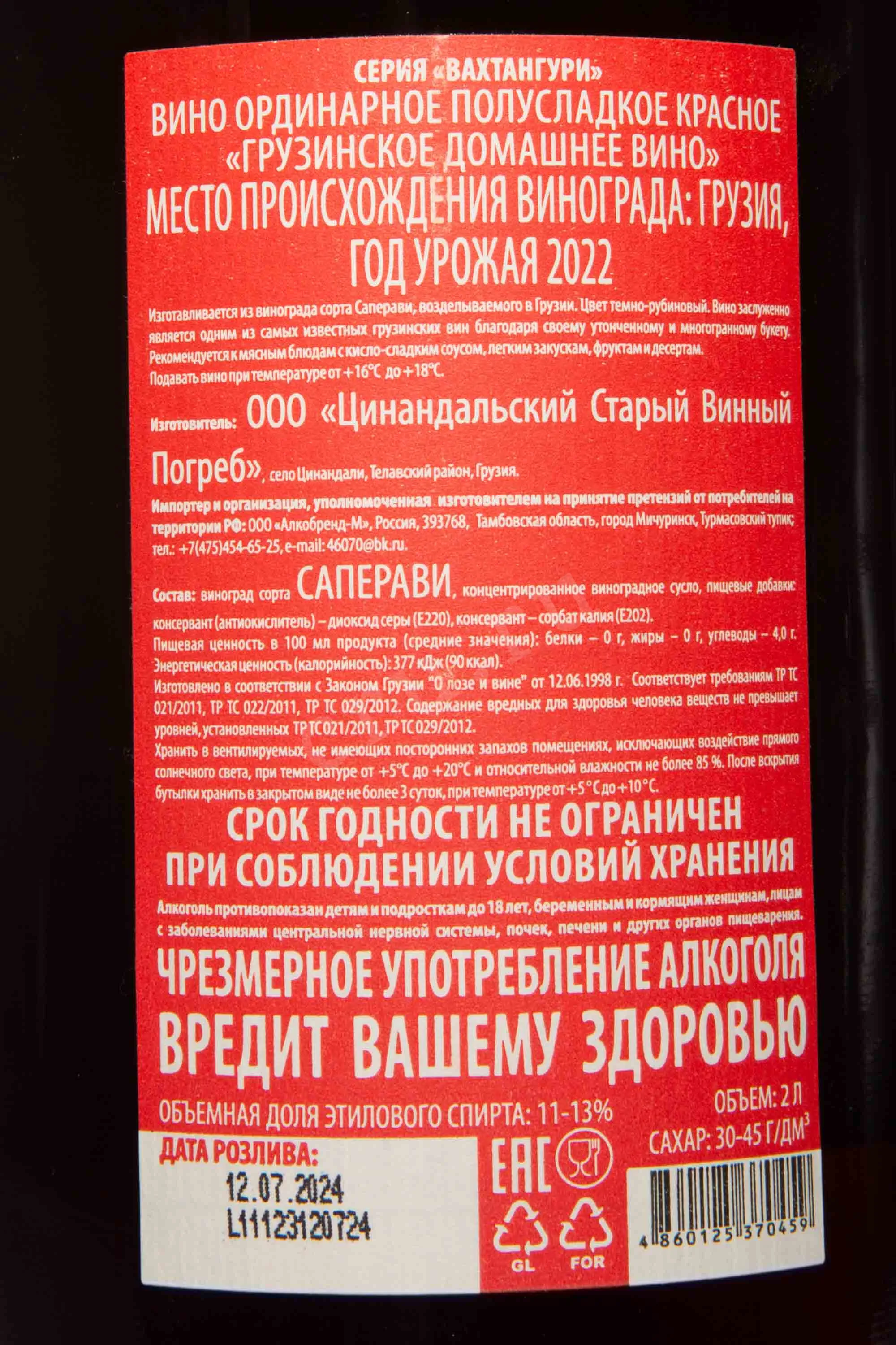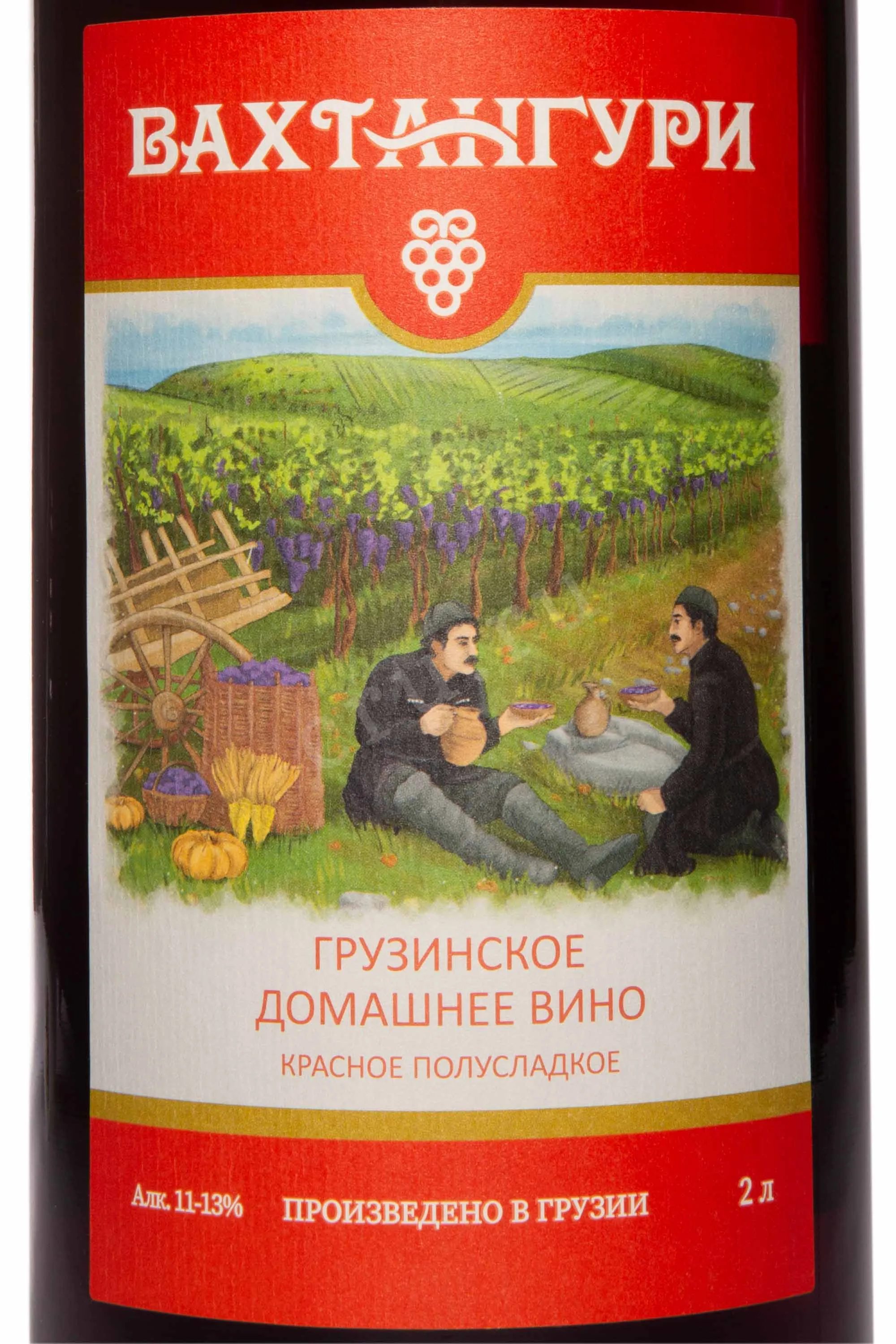 Вино Вахтангаури красное полусладкое 2,0 л создано с вниманием к грузинским традициям и особым чувством гармонии вкуса. Этот напиток изготовлен в солнечных долинах Кахетии, где перепады температур между днем и ночью придают ягодам насыщенность и сложность аромата. Производитель «ЦСВП» использовал классическую технологию частичной ферментации, при которой брожение прерывается естественным образом, сохраняя природную сладость винограда. Созревание проходило в стальных резервуарах, что позволило подчеркнуть чистоту вкусового профиля и сохранить свежесть фруктовых оттенков. Терруар виноградников — глинисто-известковый, с высоким содержанием минеральных элементов, благодаря чему напиток обрел глубокую структуру и выразительный характер.