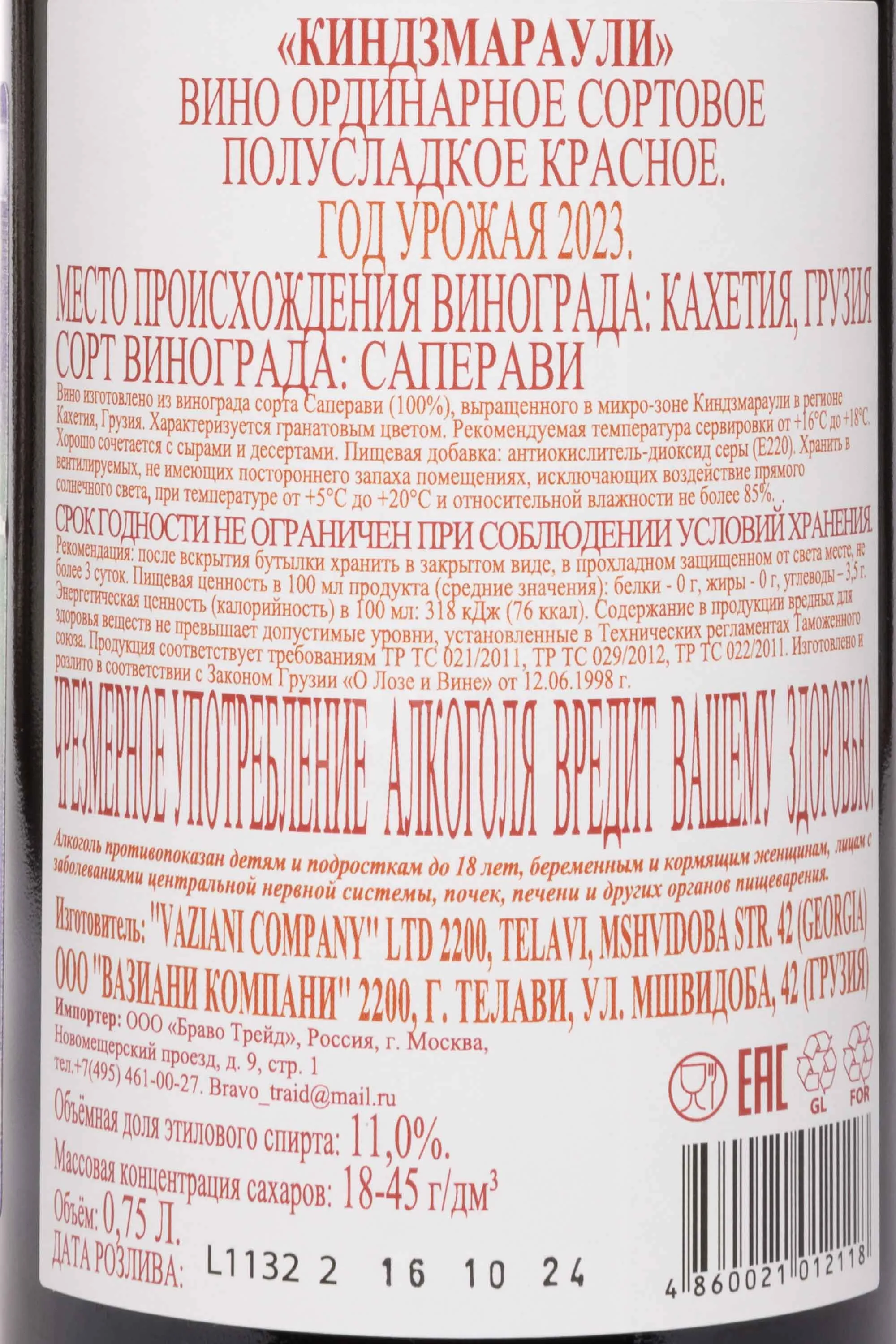 Вино Киндзмараули Вазиани 0,75 л — красное полусладкое спиртное от винодельни «Вазиани», созданное в сердце Кахетии из урожая позднего сбора. Напиток отражает богатство местного терруара, где солнечные дни и прохладные ночи Алазанской долины способствуют идеальному накоплению сахаров и сохранению природной кислотности ягод. Почвы региона, насыщенные глиной и известняком, придают напитку минеральную глубину и бархатистую текстуру. Брожение проходит в традиционных емкостях из нержавеющей стали при контролируемой температуре, что позволяет сохранить ароматический профиль и природную сладость. После ферментации напиток выдерживается в стальных резервуарах до достижения гармоничного вкусового баланса, сочетающего мягкость и свежесть.