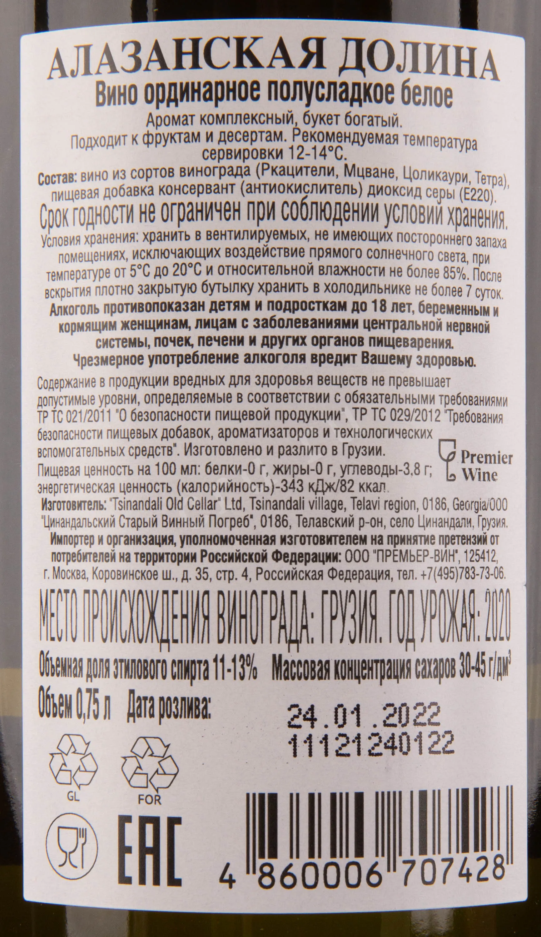 Вино Venakhi Alazani Valley 2020 0.75 l – это великолепный образец грузинского виноделия, изготовленный из винограда четырех сортов урожая одного года. Ягоды были собраны с лоз, произрастаемых в селе Цинандали Телавского муниципалитета региона Кахетия. Изысканный напиток был создан традиционным методом, согласно которому ферментация виноградного сока протекает в глиняных кувшинах, называемых квеври, при постоянно контролируемой температуре. Готовое белое полусладкое вино было бутилировано при крепости 11% и уровне сахара от 30 до 35 г/л.