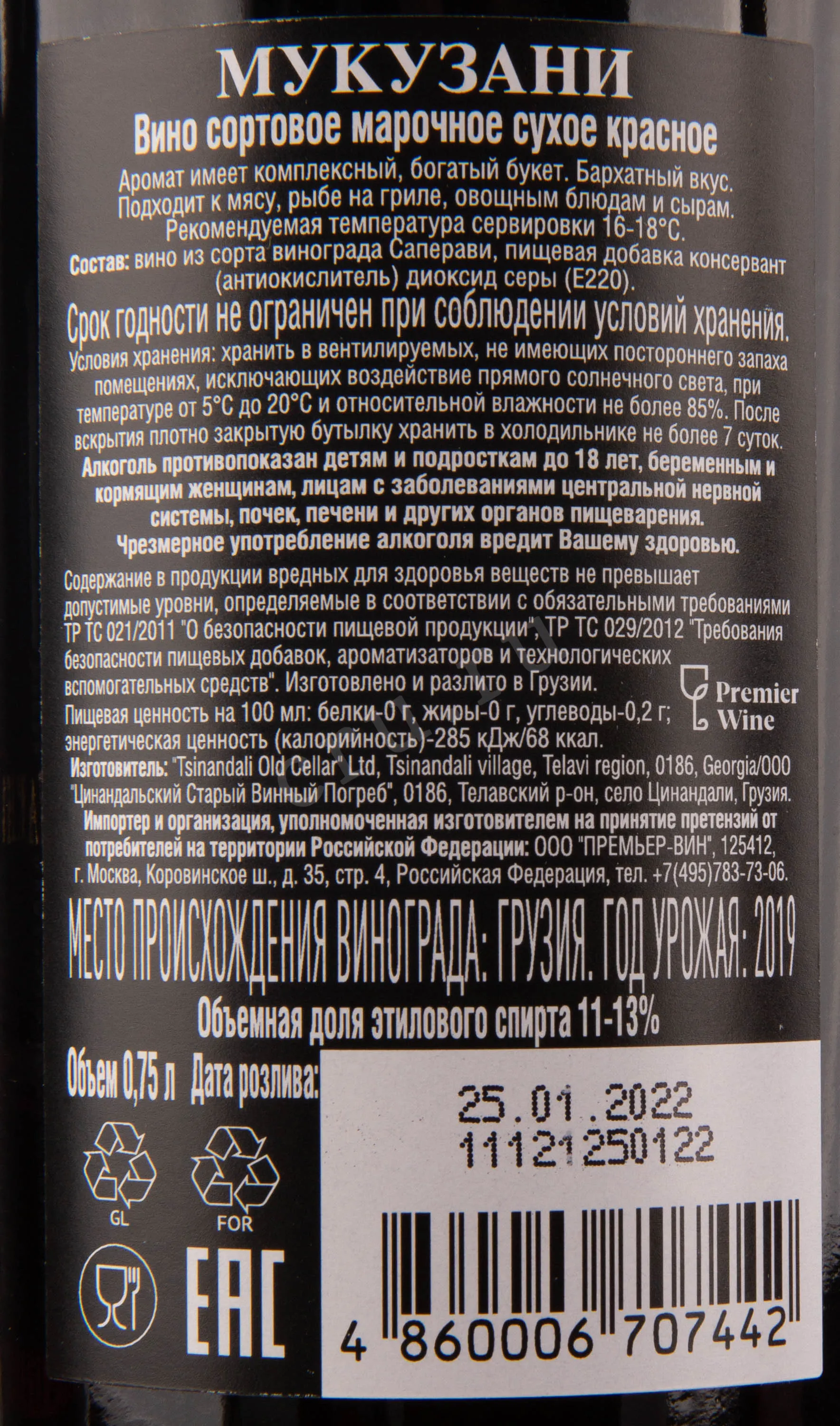 Вино Venakhi Mukuzani 2019 0.75 l – это прекрасный грузинский алкоголь, созданный на базе винограда одного сорта урожая 2019 года. Гроздья были собраны с лоз, произрастающих в гористой местности в субтропическом климате. Ягоды собирали исключительно ручным способом, чтобы обеспечить их целостность. На заводе сырье перебирают и отправляют под пресс. Полученный сок подвергается традиционной винификации в резервуарах из нержавеющей стали при контролируемой температуре. Перед бутилированием напиток выдерживается не менее года. Готовое красное сухое вино разливается при крепости 11%.