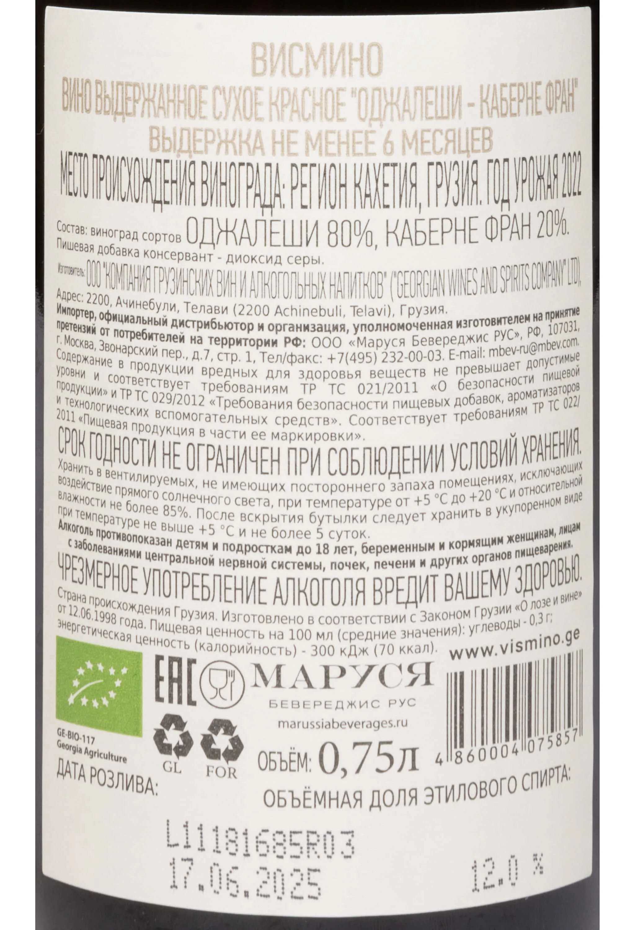 Вино Vismino Ojaleshi Cabernet Franc 2022 0.75 л — утонченный купаж редкого грузинского сорта Оджалеши и элегантного французского Каберне Фран, созданный по традиционным технологиям с бережной ручной сборкой урожая. Ягоды произрастают в Кахетии — историческом винодельческом регионе Грузии, известном своими уникальными почвенно-климатическими условиями. Континентальный климат с жарким летом и умеренными осадками придает ягодам исключительную зрелость и насыщенный вкус. Ферментация и выдержка напитка происходят в дубовых бочках, благодаря чему он приобретает сложную структуру и выразительную многослойность вкуса и аромата.