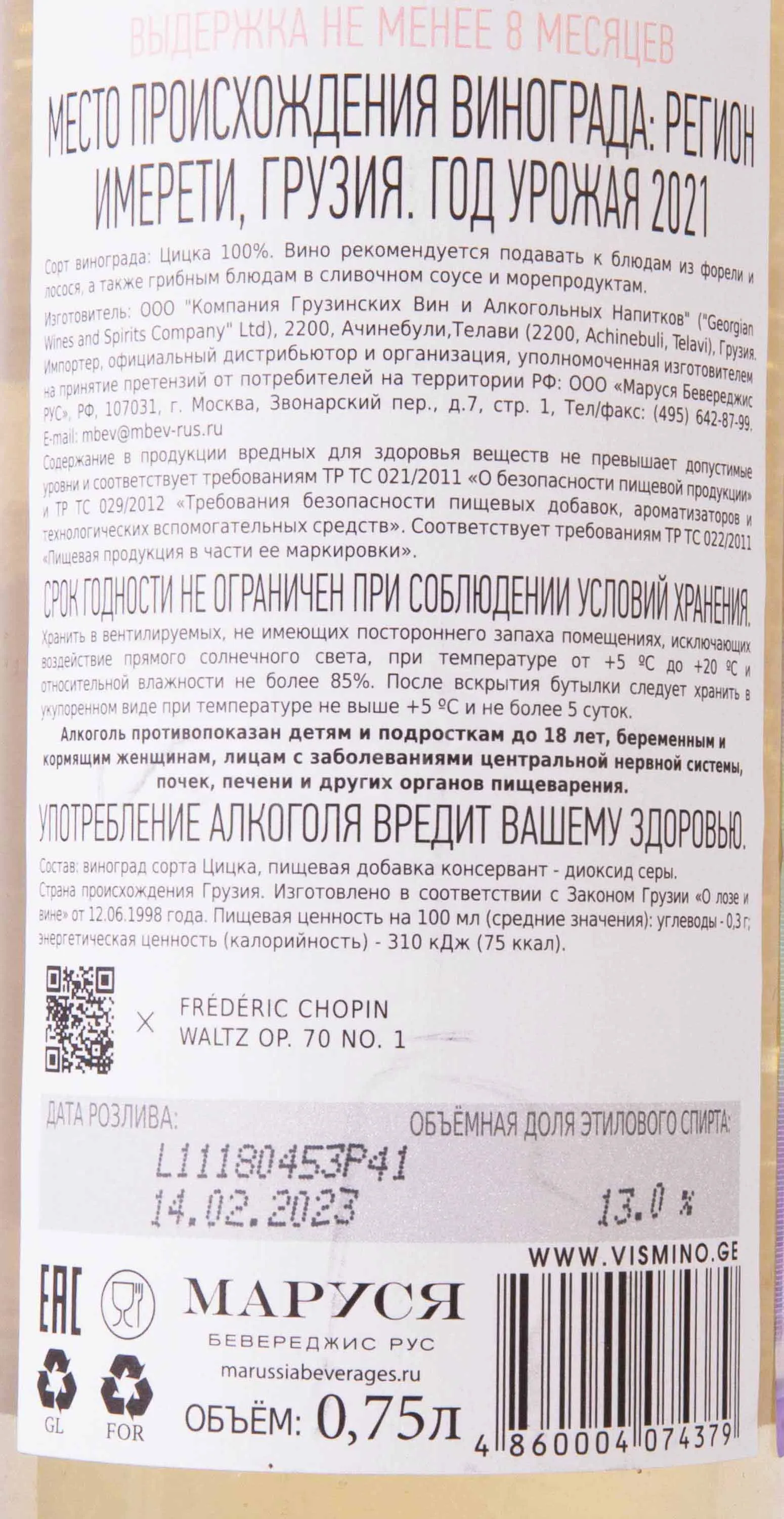 Вино Висмино Цицка 0,75 л создано на винодельне «Висмино», расположенной в живописных предгорьях Западной Грузии, где мягкий климат и известково-глинистые почвы придают ягодам особую свежесть и минеральность. Напиток изготавливается из автохтонного сорта Цицка, выращенного на склонах, обращённых к Черноморскому бризу, который смягчает температуру и сохраняет природную кислотность плодов. Урожай собирается вручную, чтобы сохранить целостность ягод и естественные ароматы. После мягкого прессования сусло проходит ферментацию при контролируемой температуре, что позволяет добиться гармонии между свежестью, телом и ароматической насыщенностью. Выдержка в стальных резервуарах сохраняет чистоту вкуса и подчёркивает природную выразительность сорта, делая напиток элегантным и сбалансированным.
