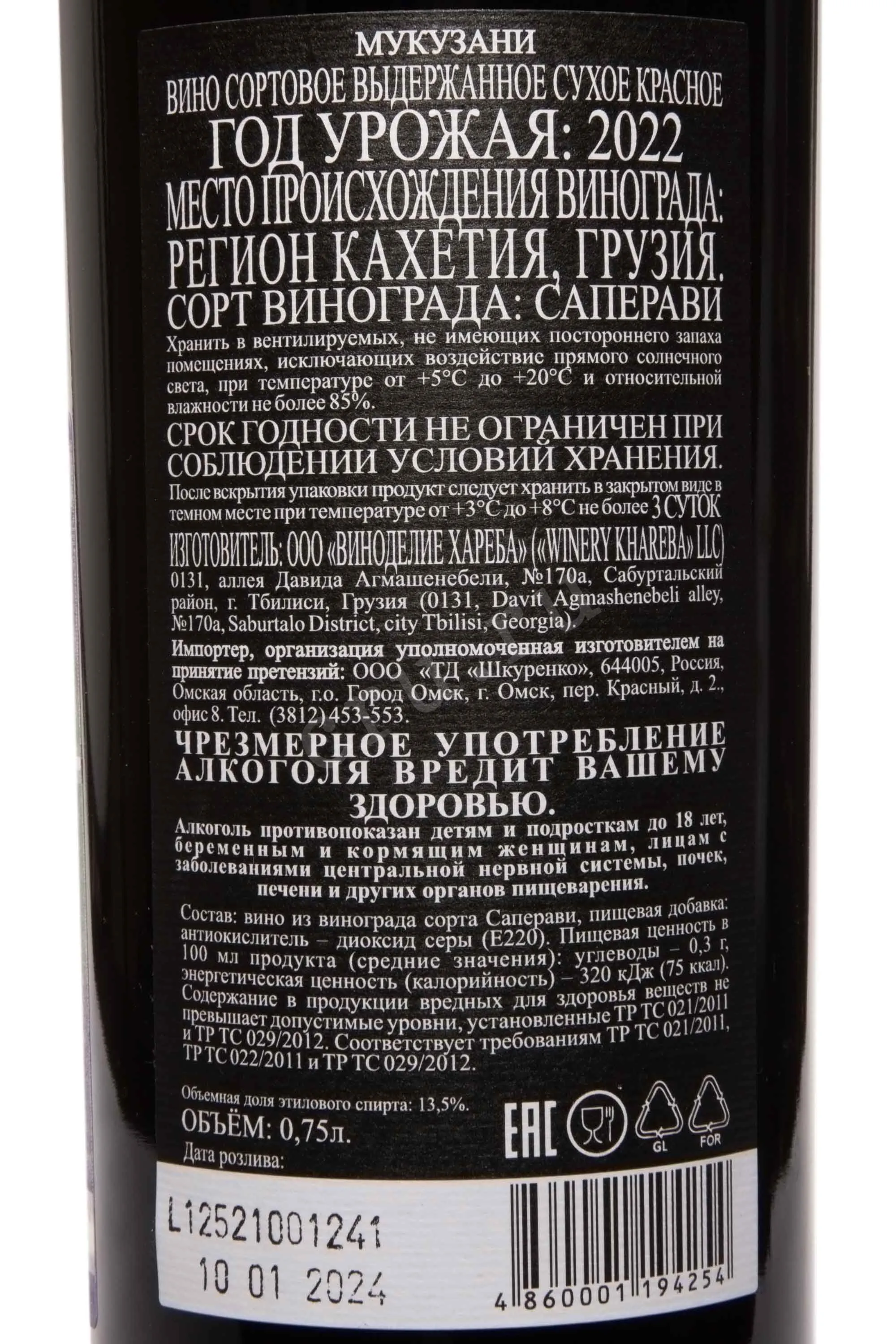 Вино Winery Khareba Mukuzani 2022 — это выдержанное красное сухое вино, произведённое из отборного винограда сорта Саперави, выращенного в сердце винодельческого региона Кахетия, в уникальной микрозоне Мукузани. Это одно из самых узнаваемых грузинских вин, отличающийся глубиной вкуса и благородным характером. Урожай 2022 года был собран вручную, после чего ягоды прошли бережную винификацию с контролем температуры, что позволило сохранить насыщенность и ароматичность сорта. Выдержка проходила в дубовых бочках, благодаря чему вино обрело выразительную структуру и мягкие танины. Это отличный выбор для тёплых вечеров и ужинов в хорошей компании. Мукузани отлично раскроется сейчас, но также может храниться ещё несколько лет.