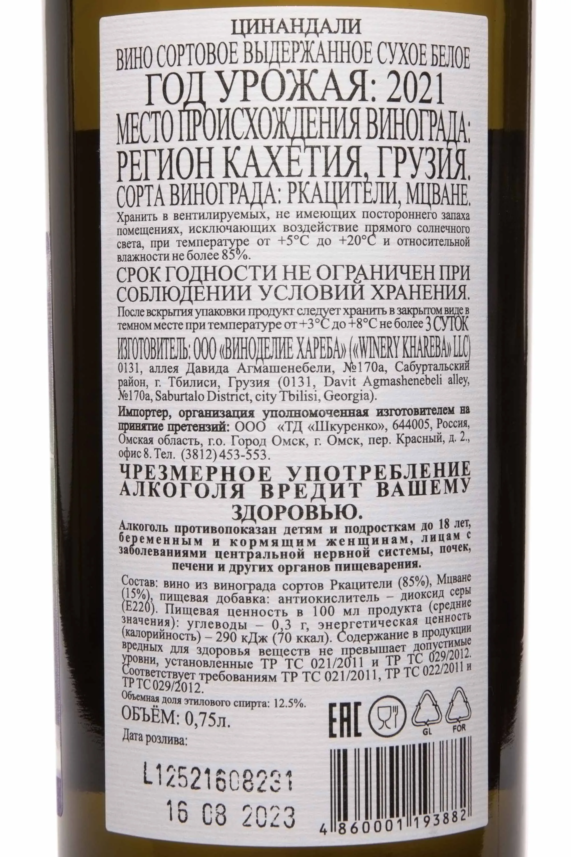 Winery Khareba Tsinandali 2021 — изысканное грузинское белое сухое вино, созданное из классических кахетинских сортов винограда, выращенных в одном из самых уважаемых винодельческих регионов страны. Этот утончённый напиток производится на предприятии ООО «Виноделие Хареба» по традиционной технологии с применением современных методов, что позволяет сохранить натуральную свежесть и выразительность винограда. Урожай 2021 года собран в солнечной Кахетии, в микрорайоне Цинандали — месте с идеальными условиями для белых сортов. Вино раскроется особенно ярко в первые 2–3 года после урожая, подчеркивая свою лёгкость, ароматическую чистоту и гастрономическую универсальность.