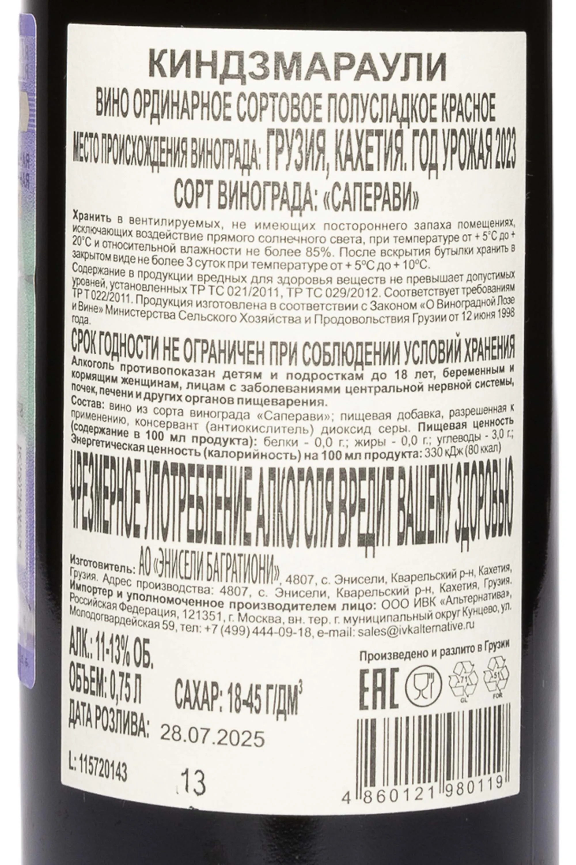 Красное полусладкое вино Zakaria Jorjadze Kindzmarauli 2023 года 0,75 л создано в сердце Кахетии, в долине реки, где теплый климат и глинисто-известковые почвы обеспечивают винограду богатую органолептику. Виноградники расположены в уникальной микрозоне Киндзмараули в окрестностях одноименной деревни. 2023 год отличался мягкой зимой и продолжительным солнечным летом, что обеспечило равномерное созревание ягод сорта Саперави. Виноград собрали вручную в оптимальной зрелости, чтобы сохранить естественную сладость и насыщенный аромат. Ферментация проходила при контролируемой температуре, процесс брожения останавливался естественным образом, когда достигался нужный баланс между сахаром и кислотностью. Вино выдерживалось в резервуарах из нержавеющей стали, что помогло сохранить чистоту вкуса и свежесть букета. Киндзмараули Захария Джорджадзе ценится за устойчивое качество и традиционное грузинское звучание, подтвержденное хорошими отзывами и высокой популярностью на рынке.