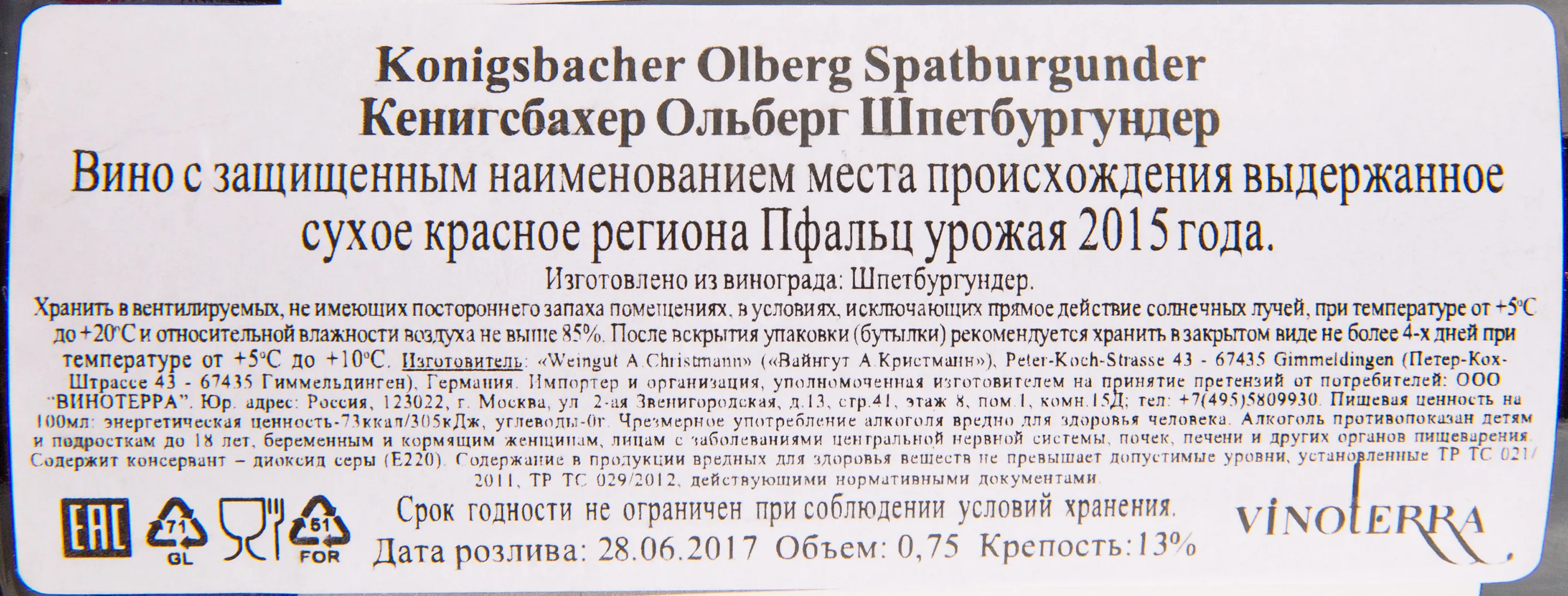 Кенигсбахер Ольберг Шпетбургундер 2015 0.75