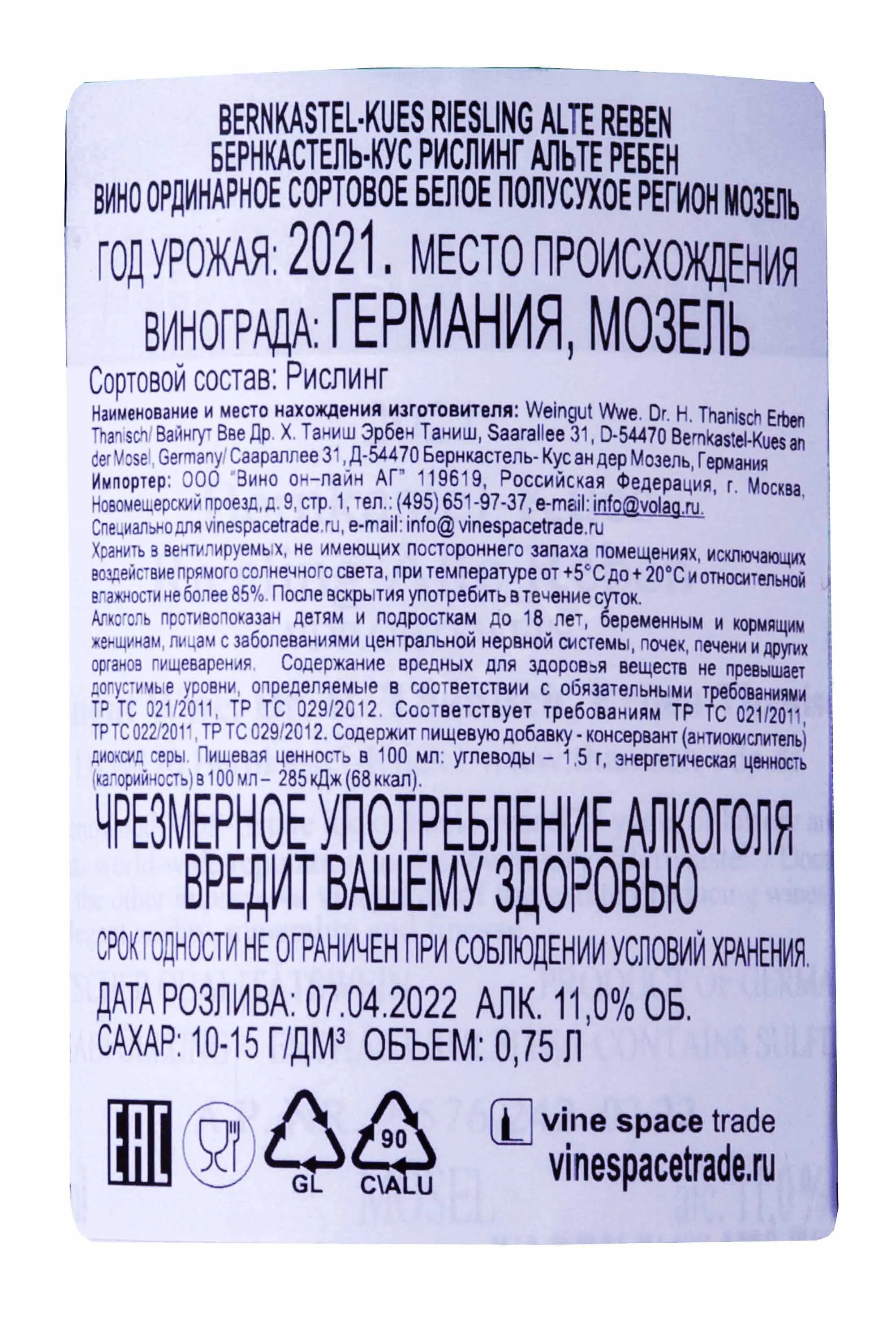 Вино Thanisch Bernkastel-Kues Riesling Alte Reben 2021 0.75 л создано из винограда, выращенного на старейших лозах региона Мозель, возраст которых превышает 60 лет. Урожай собирали вручную на крутых сланцевых склонах коммуны Бернкастель-Кус, знаменитых своим уникальным микроклиматом, где минерализованная почва и прохладный климат способствовали медленному созреванию ягод. В процессе производства использовали длительную ферментацию при низких температурах, что позволило максимально раскрыть потенциал и подчеркнуть тонкость Рислинга, придав напитку утончённость и элегантность.
