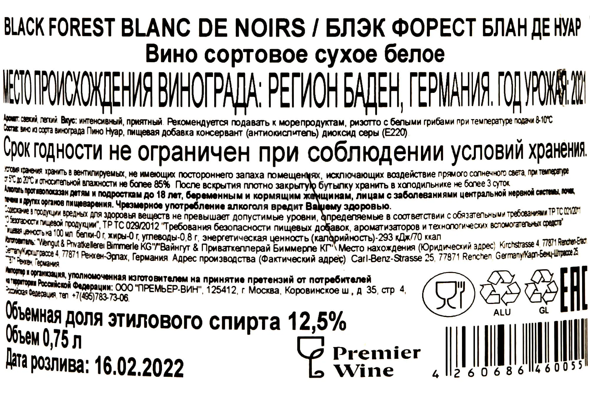Black Forest Blanc de Noirs 0.75 л купить - Немецкое вино Блэк Форест Блан де Нуар цена в магазине г. Москва, ул. Профсоюзная, д. 16/10 10:00-22:00 Ежедневно +7 (495) 920-20-02 info@cru.ru