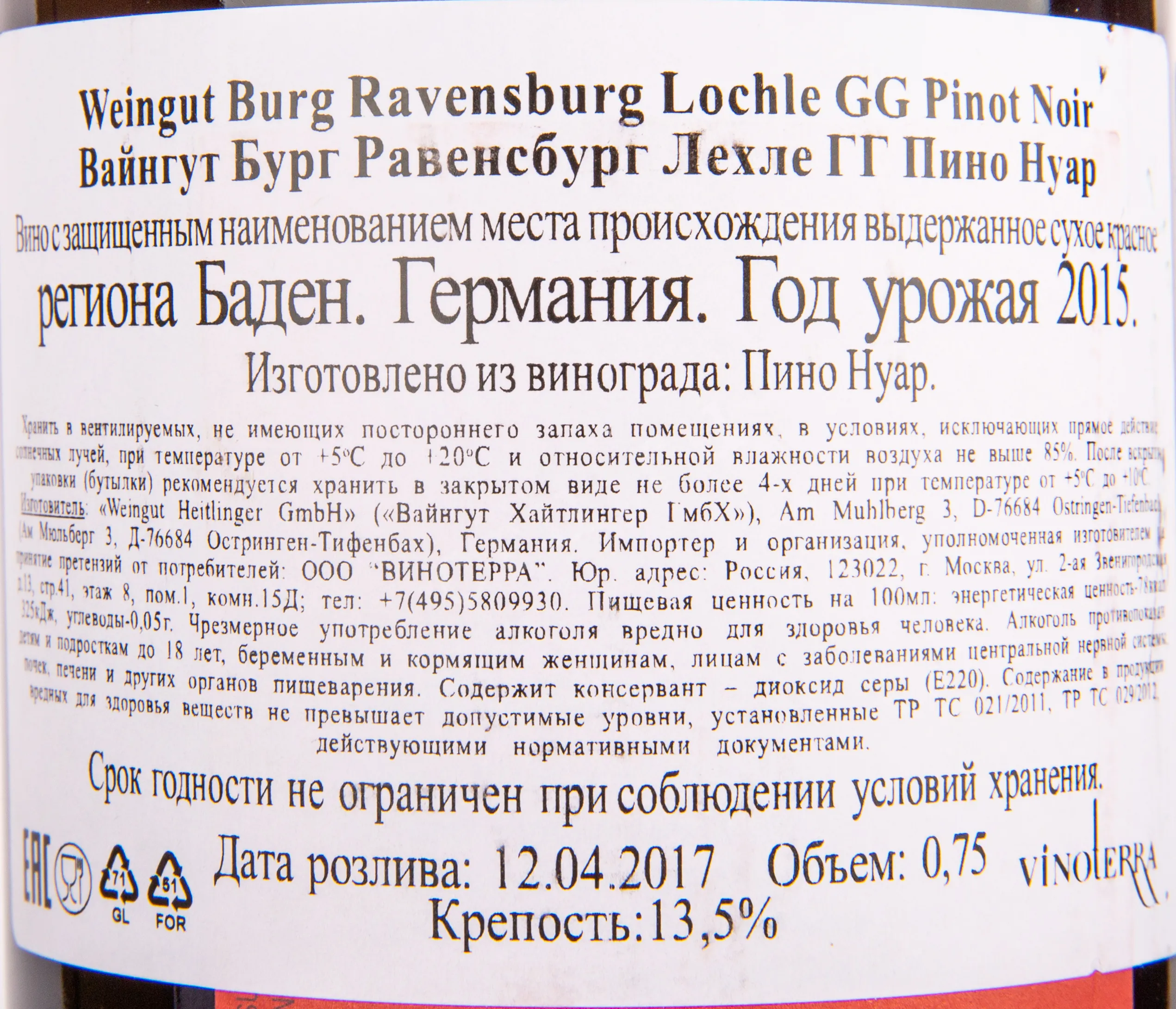 Вино Burg Ravensburg Lochle GG Pinot Noir 2015 0.75 л