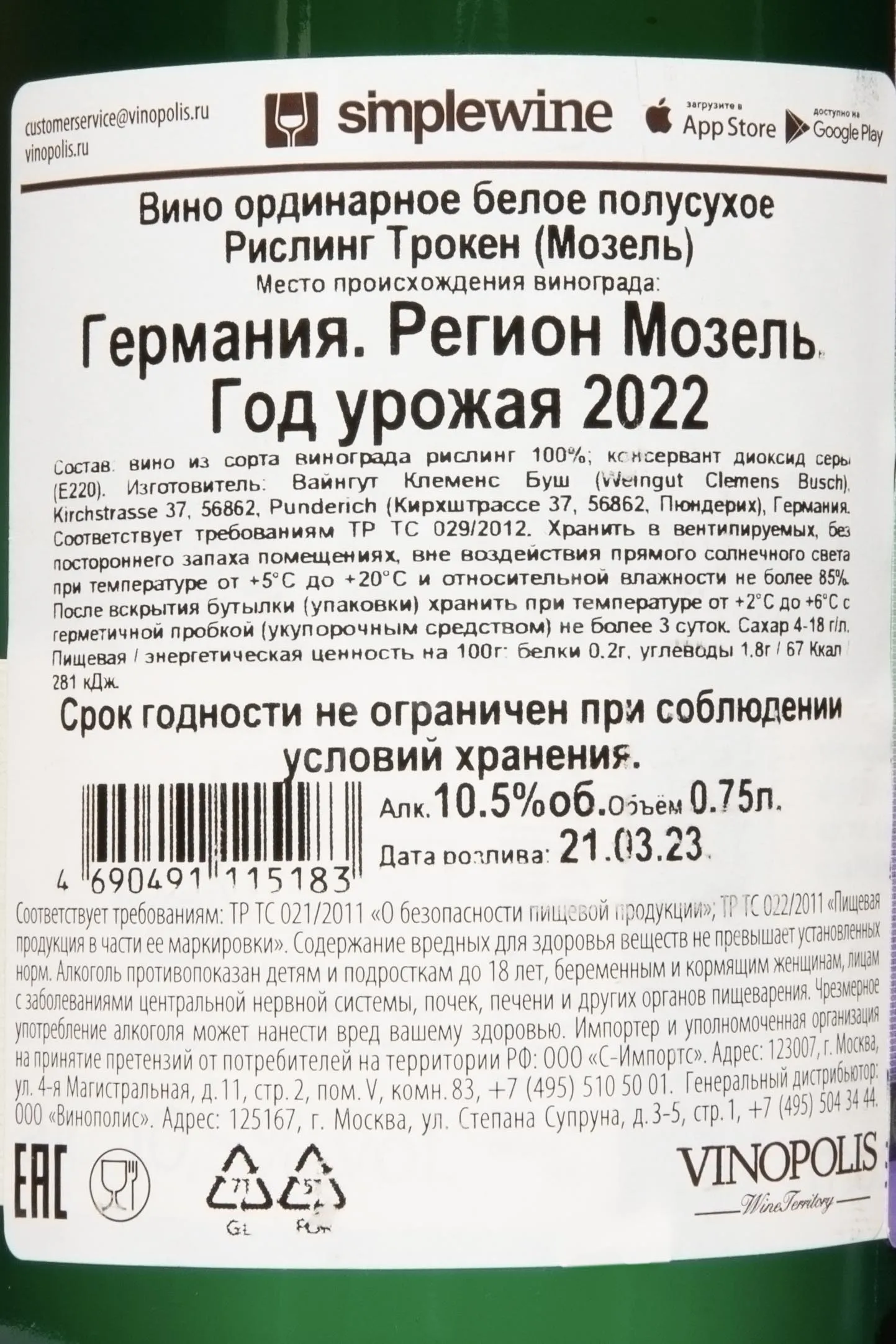 Рислинг Трокен Мозель Вайнгут Клеменс Буш 2022 0.75
