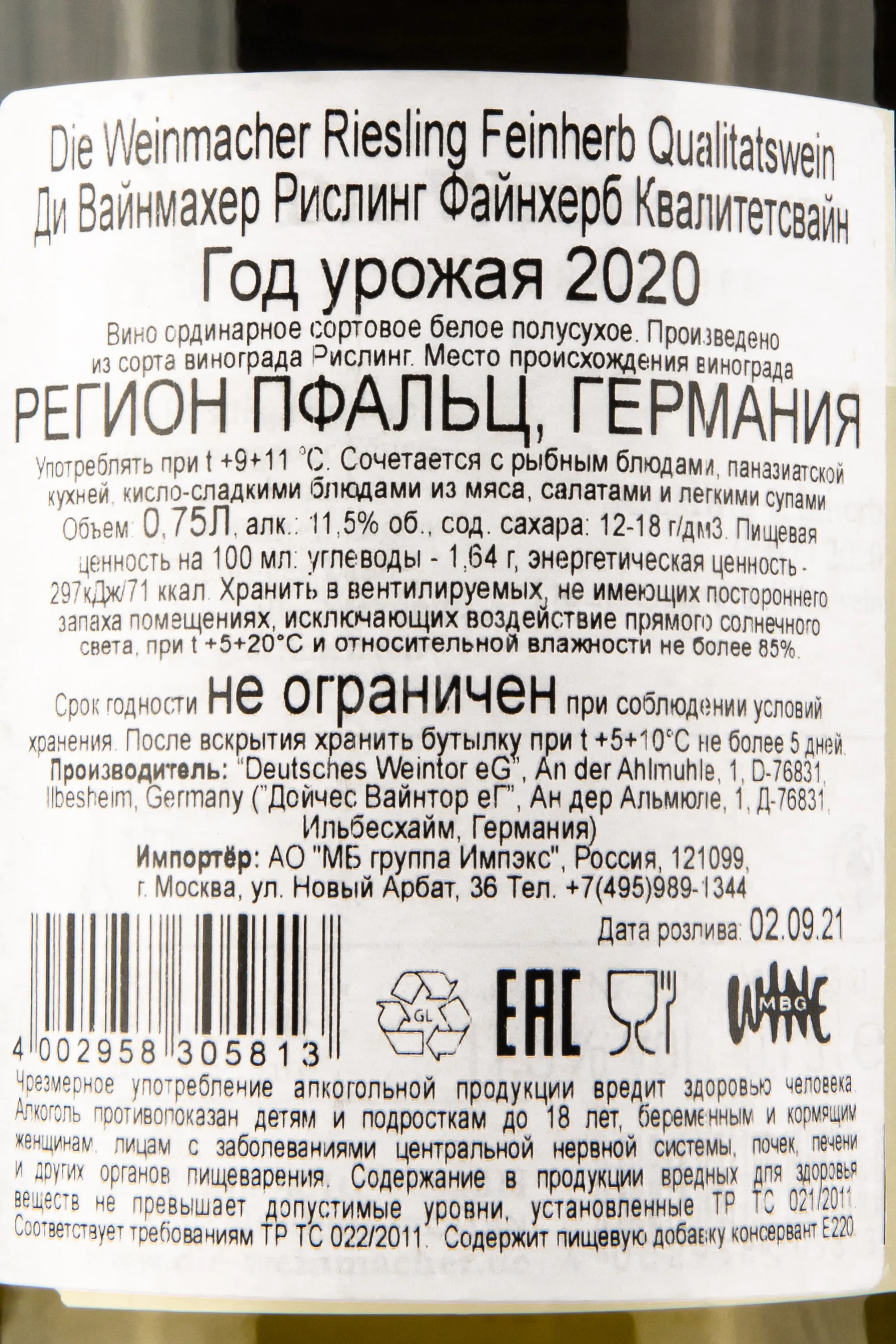 Ди Вайнмахер Рислинг Файнхерб Квалитетсвайн 2020 0.75