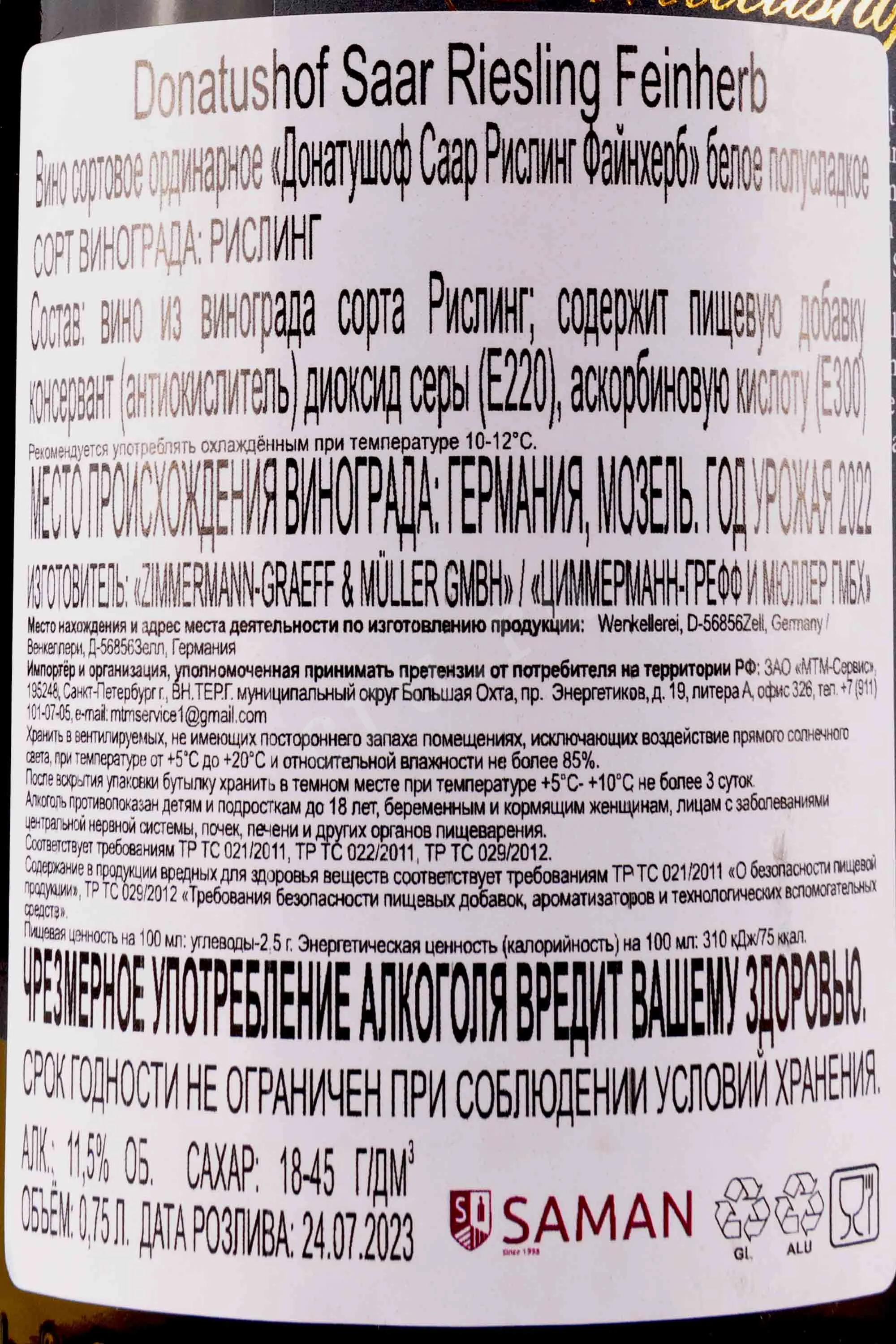 Белое полусладкое вино Donatushof Saar Riesling Feinherb 2022 0,75 л произведено винодельней в регионе Саар, Германия. Виноград выращивают на крутых сланцевых склонах, которые богаты минералами и придают вину характерную свежесть. Урожай был собран вручную. В 2022 году он оказался меньше по объему, чем в предыдущие годы, из-за сильной засухи летом. Ситуацию несколько исправили дожди в августе и сентябре. Зато виноград не болел, накопил много сахара и ароматических веществ в высокой концентрации. Ферментация проводилась в ёмкостях из нержавеющей стали без выдержки в дубе, благодаря чему сохраняются яркие фруктовые оттенки. Это вино ценят за гармоничный баланс сладости и кислотности. Оно получило золотую медаль на международном конкурсе MUNDUS VINI.