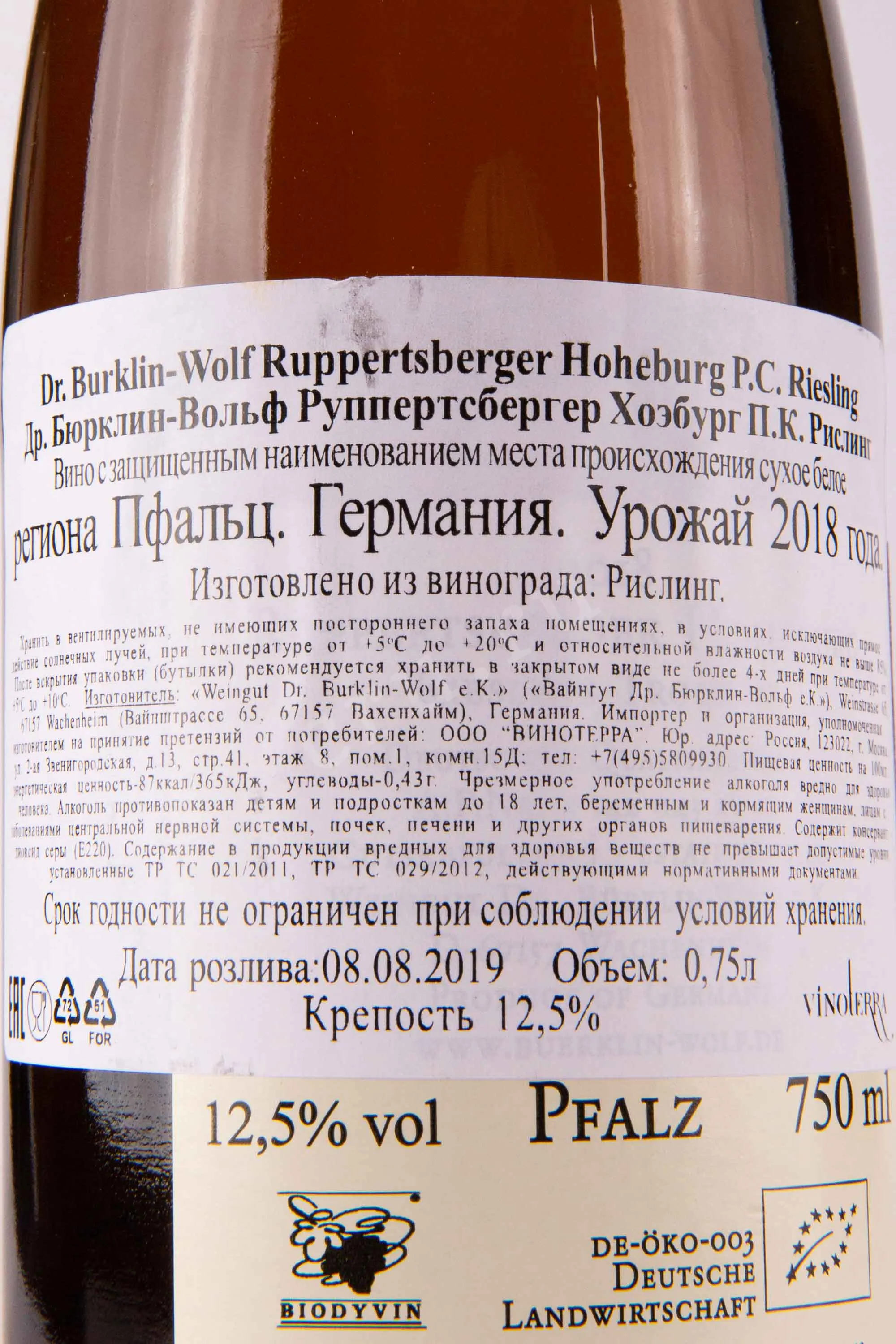 Вино Dr. Buerklin-Wolf Ruppertsberger Hoheburg P.C. Riesling 2018 0.75 л было создано из винограда, выращенного на премиальном винограднике Hoheburg, расположенном в регионе Пфальц на юго-западе Германии. Урожай собирали вручную с отдельных участков террасного виноградника, почва которого характеризовалась богатством песчаника и известняка, что придавало особый минеральный оттенок конечному напитку. При производстве использовались исключительно органические методы и принципы биодинамики, а ферментация проходила естественным образом на диких дрожжах, подчеркнув аутентичность и индивидуальность напитка.