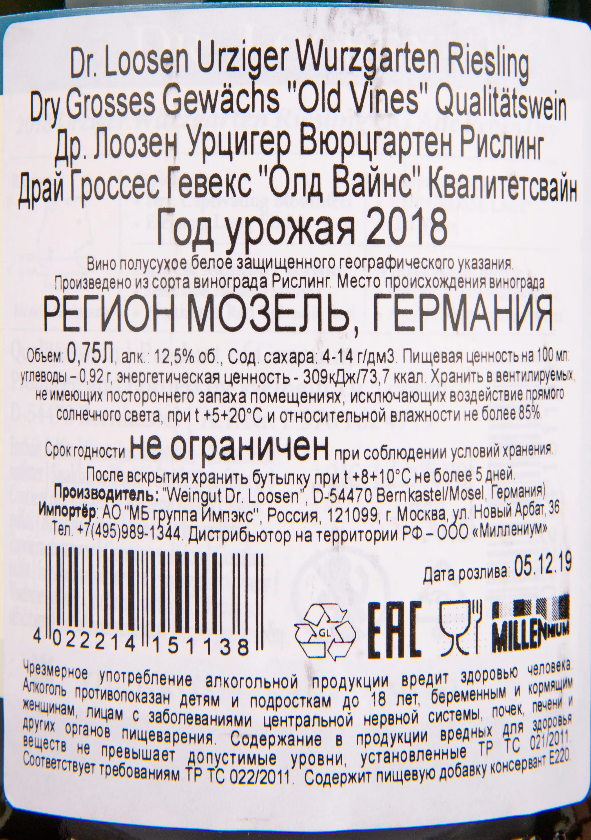 Вино Dr. Loosen Urziger Wurzgarten Riesling Dry Grosses Gewächs Old Vines Qualitätswein 2018 0.75 л рождается на крутых сланцевых склонах знаменитого виноградника Ürziger Würzgarten в регионе Мозель. Урожай собирается вручную с лоз возрастом более 70 лет, после чего ягоды бережно прессуются целыми гроздьями и ферментируются естественным образом в старинных дубовых фудерах. Вино выдерживается на осадке около года, приобретая минеральную глубину и утончённость благодаря особенностям красного вулканического сланца, характерного исключительно для этого терруара. Деликатная технология производства и уникальный микроклимат виноградника делают этот образец подлинной драгоценностью Мозеля.