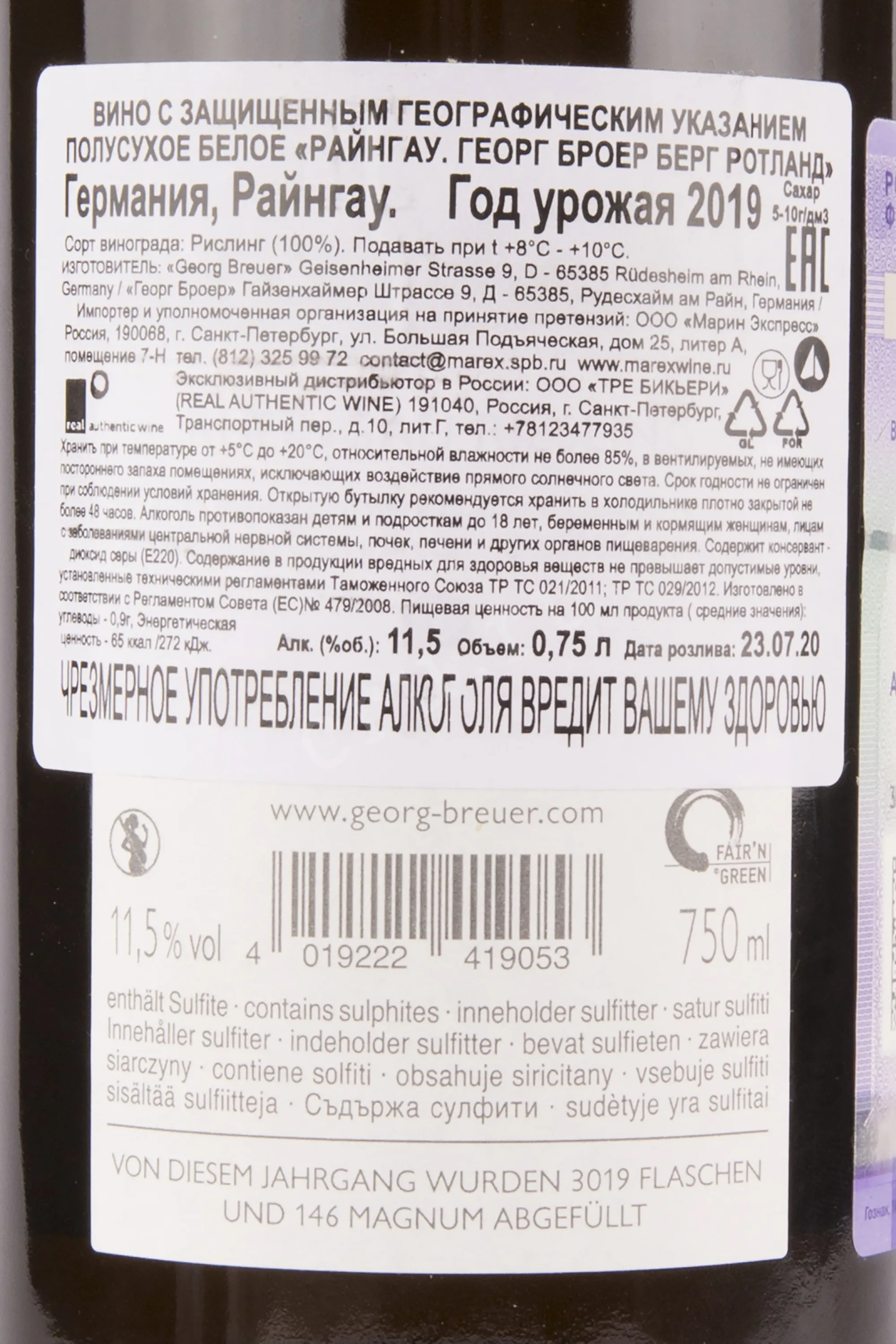 Вино Georg Breuer Berg Rottland Riesling Rheingau 2019 0.75 л создано из ягод, выращенных на винограднике Берг Роттланд, расположенном на крутых склонах вдоль реки Рейн, где уникальный терруар формируют сланцевые и кварцитовые почвы. Благодаря прохладному климату и ручному сбору зрелых ягод в несколько этапов, удается сохранить яркую кислотность, а длительная ферментация в стальных емкостях и частичная выдержка в нейтральных дубовых бочках подчеркивают утонченность и минеральный характер напитка. Результатом становится элегантное, выразительное вино с отличным потенциалом к выдержке.