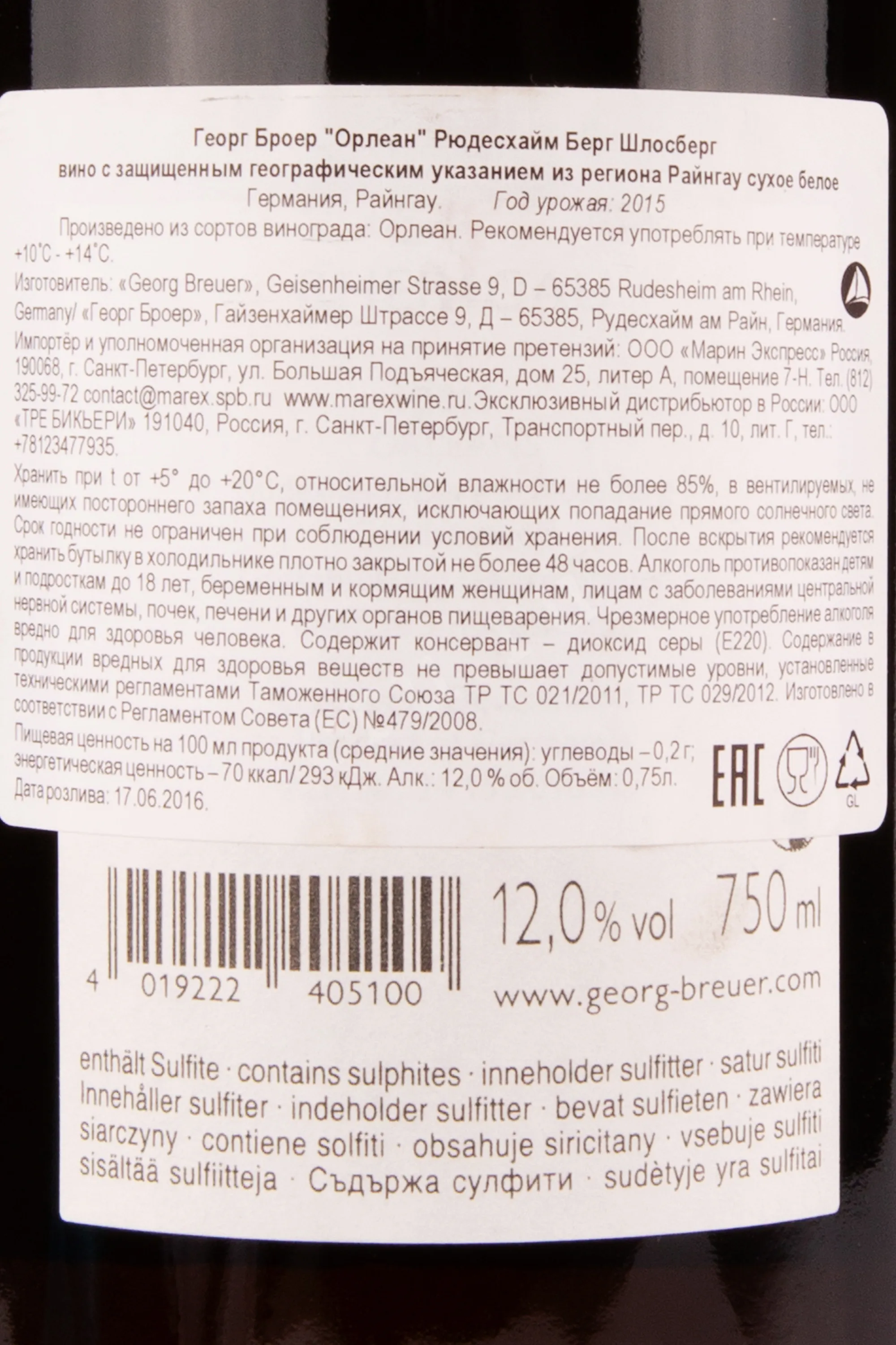 Вино Georg Breuer Orleans Rudesheimer 2015 0.75 л — исключительный образец немецкого виноделия с берегов Рейна, созданный на семейной винодельне Georg Breuer, расположенной в регионе Рюдесхайм. Особенность напитка заключается в использовании редкого сорта Орлеан, возрождённого виноделами хозяйства по традиционной технологии, которая предполагает ферментацию и выдержку на натуральных дрожжах в больших дубовых бочках. Виноград собирают вручную с виноградников на крутых склонах с каменистыми сланцевыми почвами, которые дарят напитку уникальную минеральность, выразительный характер и отличительную структуру.