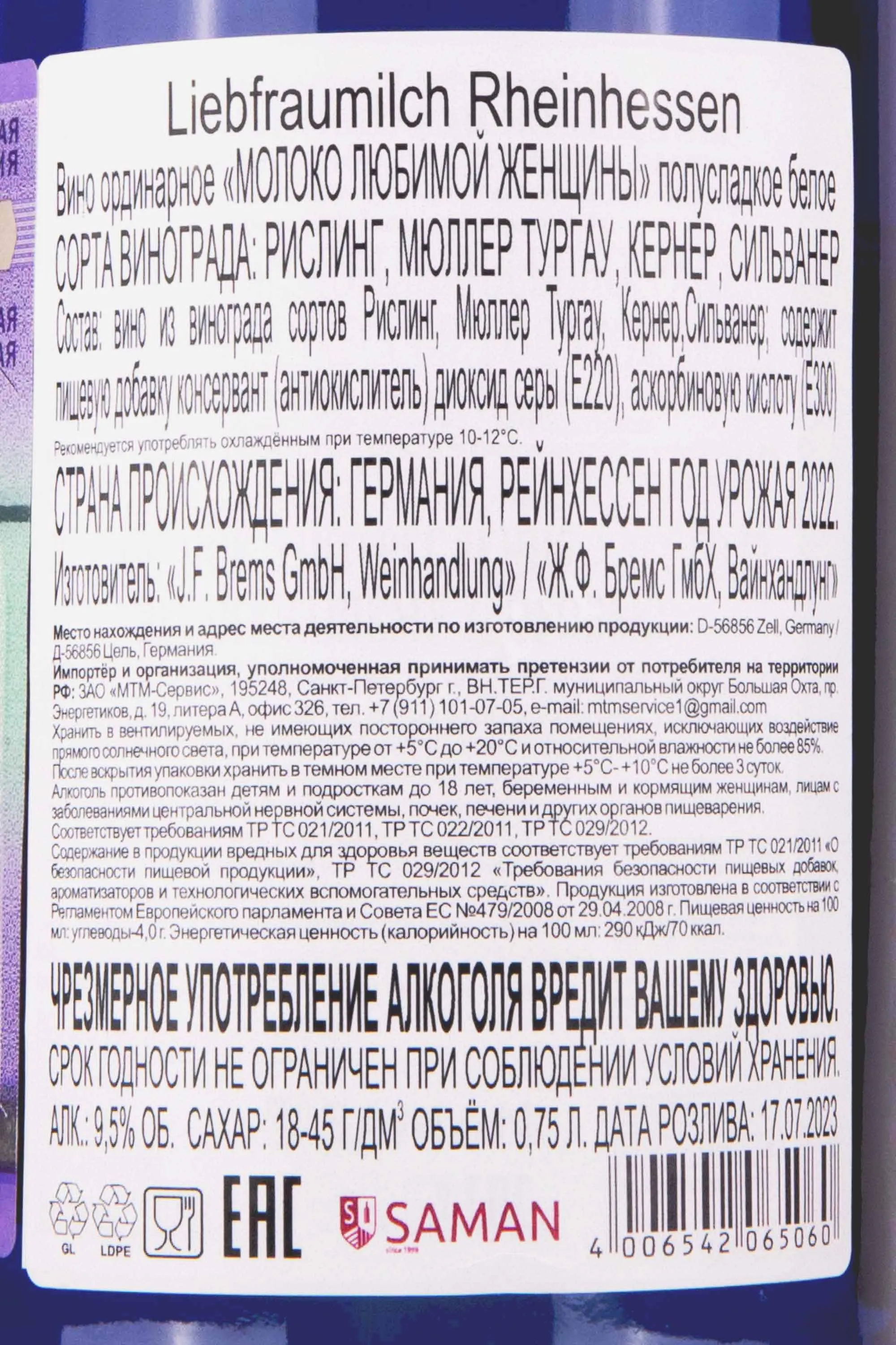 Вино J. F. Brems Liebfraumilch 2022 0.75 л было создано в живописном регионе Рейнхессен, где мягкий климат, плодородные почвы и солнечные склоны обеспечили идеальные условия для выращивания винограда. Урожай собирали вручную в утренние часы, чтобы ягоды сохранили свежесть и выразительность вкуса. Благодаря щадящему прессованию и низкотемпературной ферментации напиток приобрел тонкий букет и сбалансированный, гармоничный вкус. Выдержка проходила в стальных емкостях, что позволило сохранить яркость аромата и легкость структуры.