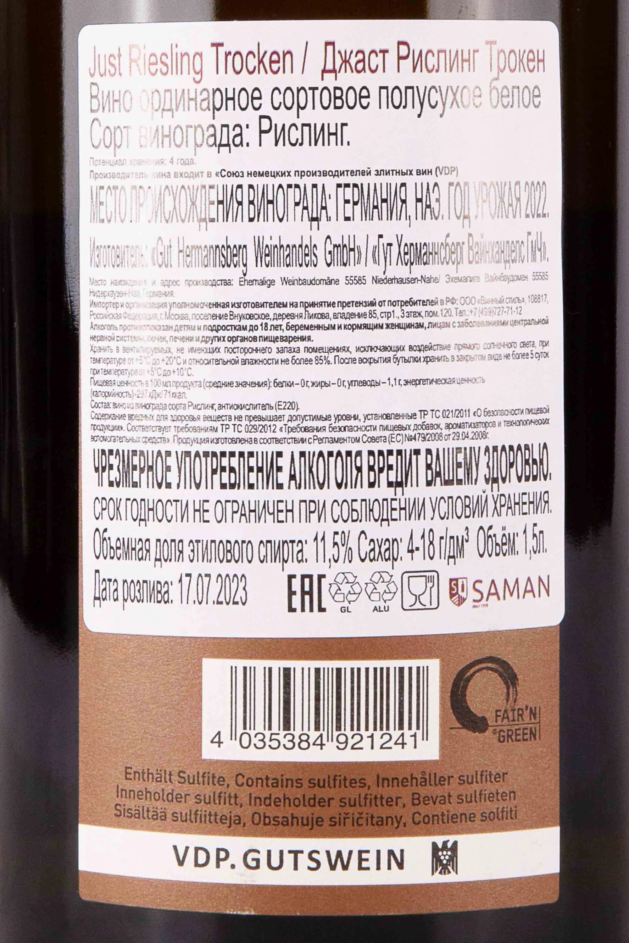 Вино Gut Hermannsberg Just Riesling Trocken 2022 1.5 л создано из отборного урожая Рислинга, собранного вручную с уникальных виноградников региона Наэ в Германии. Терруар характеризуется разнообразными почвами вулканического происхождения, богатыми минералами и сланцем, благодаря чему напиток приобретает исключительную свежесть и минеральную выразительность. Производство осуществляется по бережной технологии холодной ферментации в стальных резервуарах, что позволяет сохранить яркий, натуральный характер и подчеркнуть тончайшие нюансы сорта.