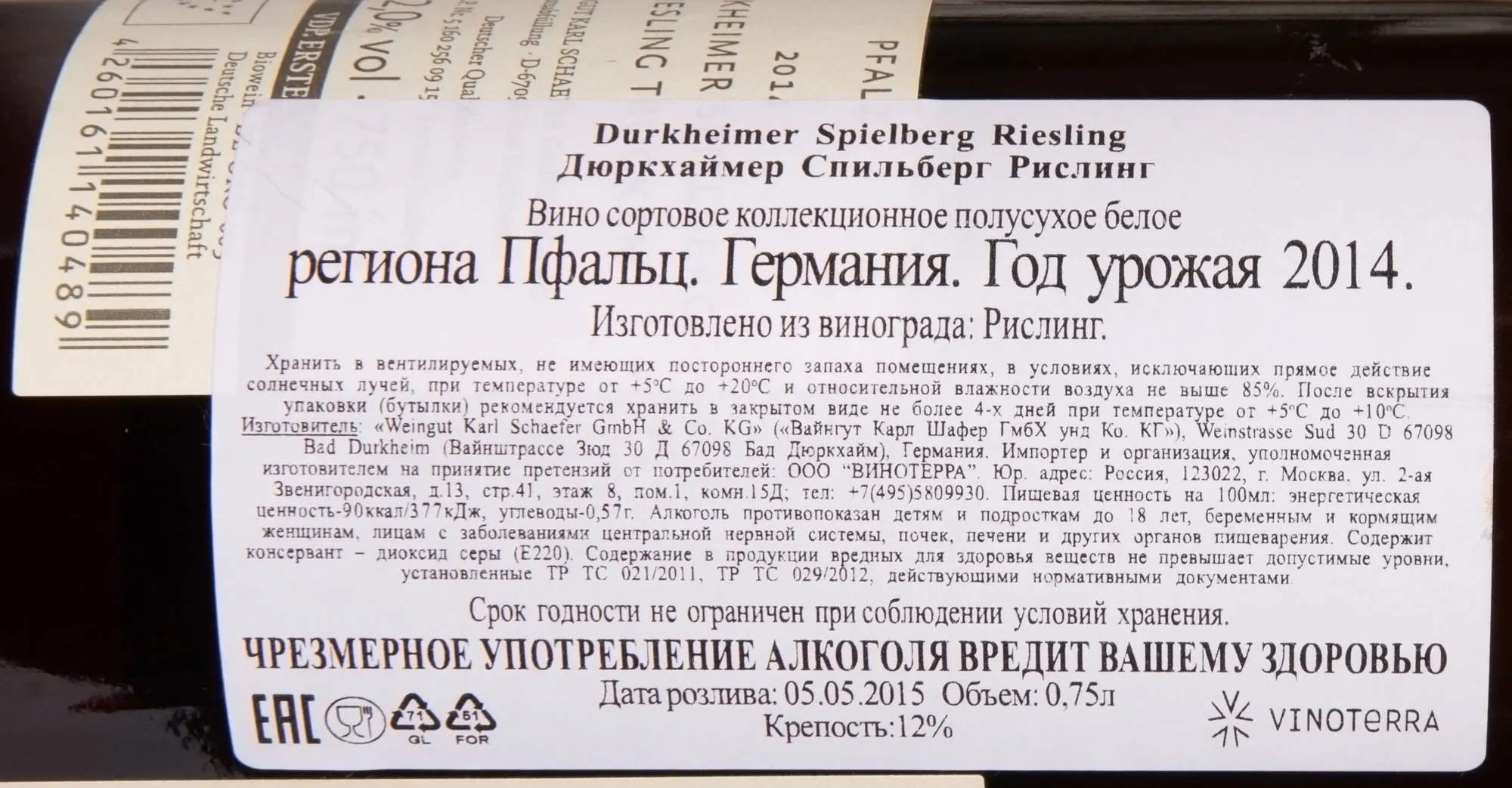 Вино Karl Schaefer Durkheimer Spielberg Riesling Medium-Dry 2014 0.75 л было создано из винограда, выращенного на историческом винограднике Шпильберг, расположенном в живописной местности Пфальц на юго-западе Германии. Урожай собрали вручную на склонах с известково-глинистыми почвами, богатых минералами, что обеспечило напитку тонкость и многогранность. Для создания гармоничного вкуса ягоды подвергли бережному прессованию и ферментировали при контролируемой температуре в стальных резервуарах, сохранив свежесть и фруктовые оттенки. Выдержка длилась несколько месяцев на осадке, благодаря чему вино приобрело утонченную структуру и шелковистость.
