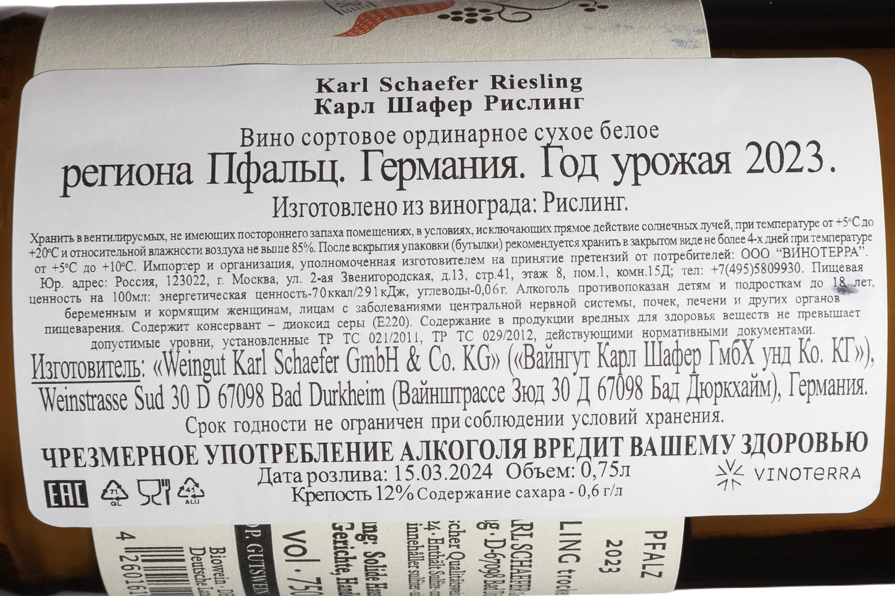 Вино Karl Schaefer Riesling 2022 0.75 л было создано на винодельне Karl Schaefer, расположенной в регионе Пфальц, Германия. Урожай собрали вручную на известняковых склонах виноградников, обладающих уникальным микроклиматом и минерализованной почвой. В процессе ферментации производитель использовал традиционную технологию медленного холодного брожения, благодаря чему напиток сохранил природную свежесть и тонкие фруктовые оттенки. После выдержки в стальных емкостях на протяжении нескольких месяцев напиток приобрёл элегантность, насыщенный вкус и выраженный терруарный характер.