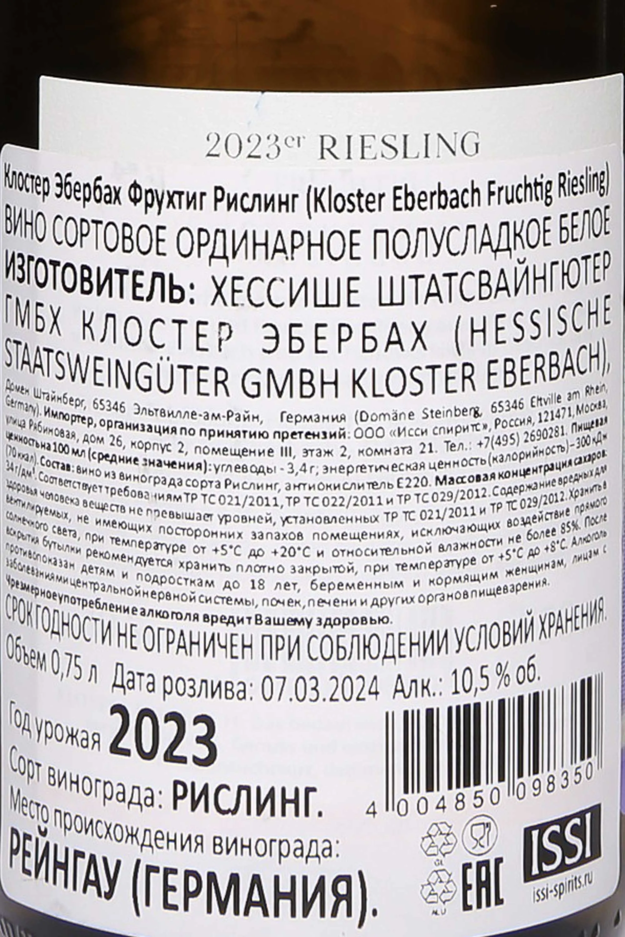 Вино Kloster Eberbach Fruchtig Riesling 2022 0.75 л было создано на винодельне, расположенной в историческом монастыре Эбербах, в самом сердце региона Рейнгау, где терруар отличается уникальным сочетанием сланцевых и известняковых почв. Ягоды собирались вручную, после чего подверглись мягкому прессованию и холодной ферментации в стальных ёмкостях, что позволило сохранить природную свежесть и деликатную фруктовость. Благодаря этой технологии напиток приобрёл яркий, сочный характер с утончённым балансом сладости и кислотности, передающий все тонкости местного микроклимата.