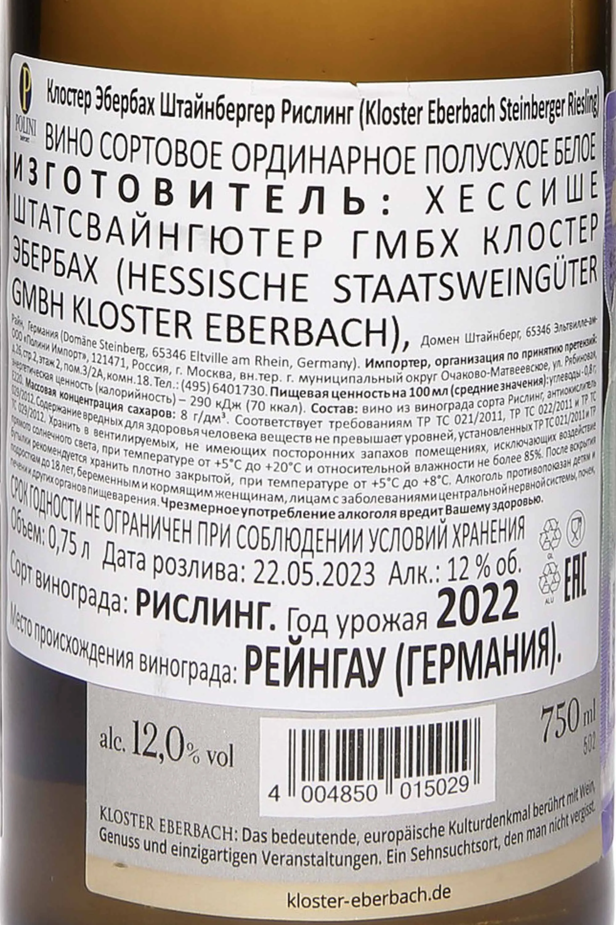 Белое полусухое вино Kloster Eberbach Steinberger Riseling Trocken 2022 года 0,75 создается в историческом регионе Рейнгау, известном своим прохладным климатом и сланцевыми почвами. Эти условия придают букету выразительную свежесть и минеральность. Урожай 2022 года оказался удачным: лето было теплым, но не чрезмерно жарким, а дожди пришлись вовремя, что обеспечило хорошую зрелость ягод. Виноград собирали вручную, с бережной сортировкой. Ферментация проходила в стальных емкостях при контролируемой температуре, что позволило сохранить чистый фруктовый профиль. Выдержка на тонком осадке придала вину округлость и дополнительную глубину вкуса. Штайнбергер считается флагманским виноградником монастыря Эбербах, и вина с этого терруара регулярно получают высокие оценки критиков и упоминаются в авторитетных рейтингах. Винтаж 2022 года отмечен Falstaff Magazine (90/100, «Восхитительное вино») и James Suckling (90/100, «Экстраординарное вино»).