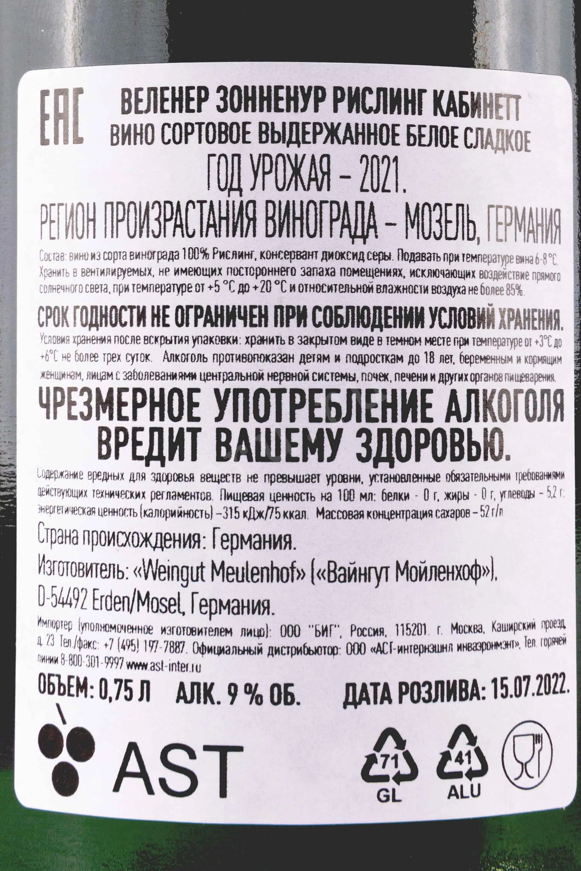 Мойленхоф Веленер Зонненур Рислинг Кабинетт 2021 0.75