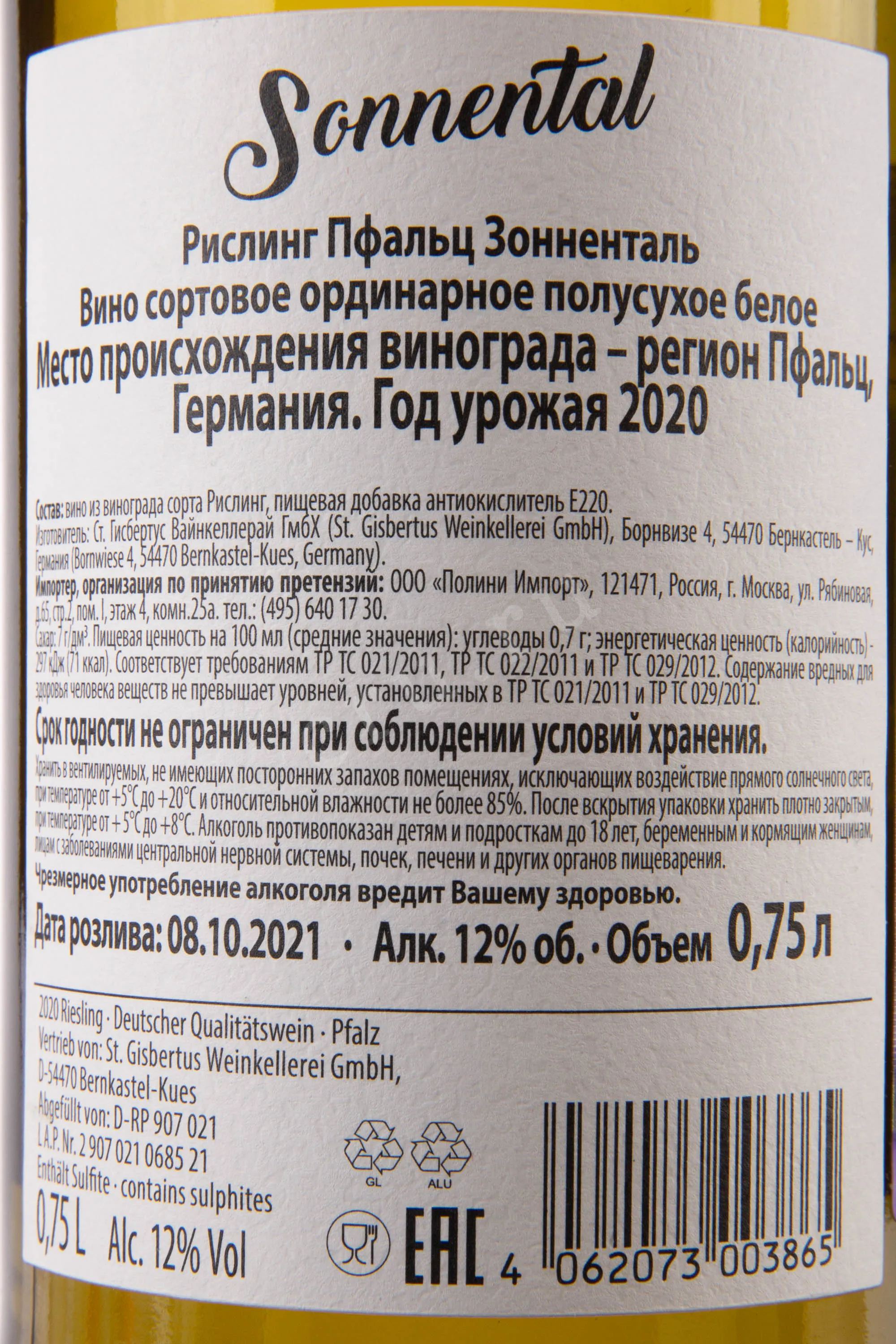 Вино Riesling Pfalz Sonnental 2024 0.75 л производится из отборного винограда, собранного вручную на живописных склонах региона Пфальц, известного уникальным терруаром с преобладанием известняково-глинистых почв и умеренным климатом, благодаря чему виноград приобретает выразительную минеральность и яркую свежесть. Ферментация проводится по традиционному методу в стальных резервуарах при контролируемой низкой температуре, позволяющей максимально сохранить тонкие фруктовые оттенки и элегантный баланс кислотности, характерные для Рислинга.