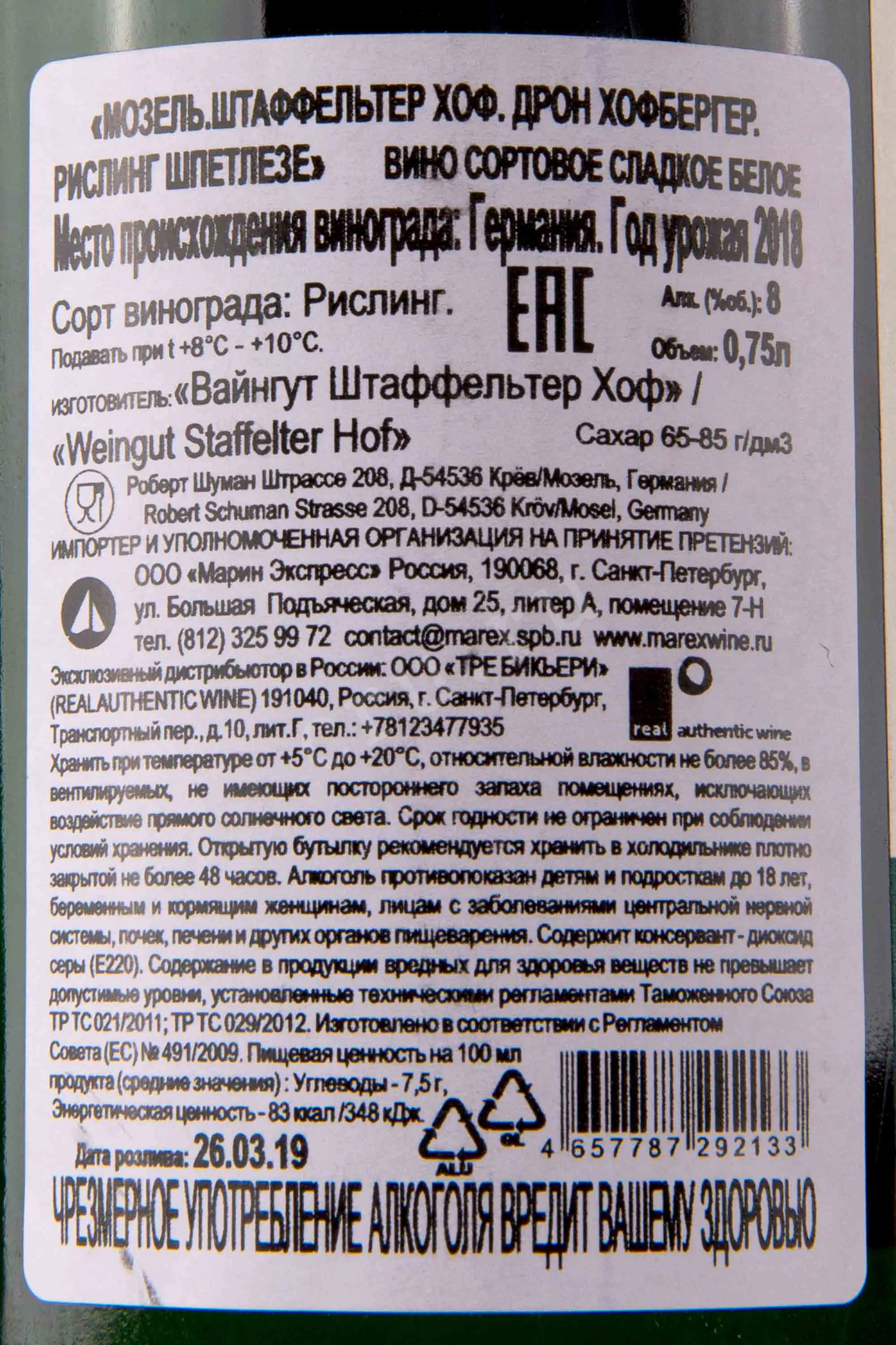 Белое сладкое вино Staffelter Hof Dhron Hofberger Riesling Spatlee 2018 0,75 л — элегантный Рислинг с ярко выраженной сладостью. Виноград выращивают на крутых сланцевых склонах в знаменитом винном регионе Мозель в Германии. Урожай собирают вручную, ферментация вина проходит естественным путём на диких дрожжах. Выдерживают напиток в стальных ёмкостях, что позволяет сохранить свежесть и яркость вкуса. Особенность этого винтажа заключается в гармоничном сочетании сладости, минеральных нот и выразительной кислинки. Урожай 2018 года получил высокие оценки винных критиков и входит в рейтинги лучших десертных Рислингов Германии.