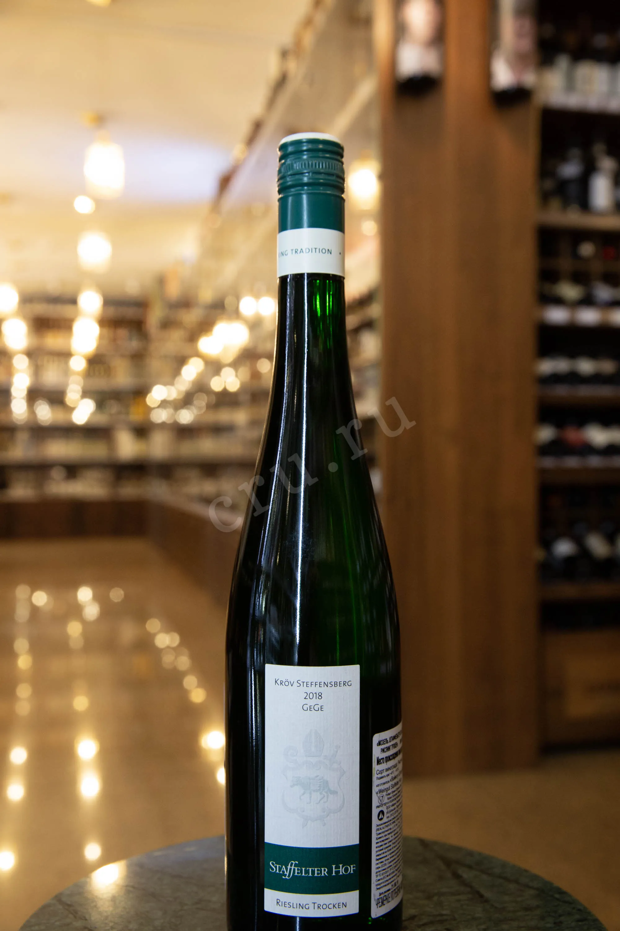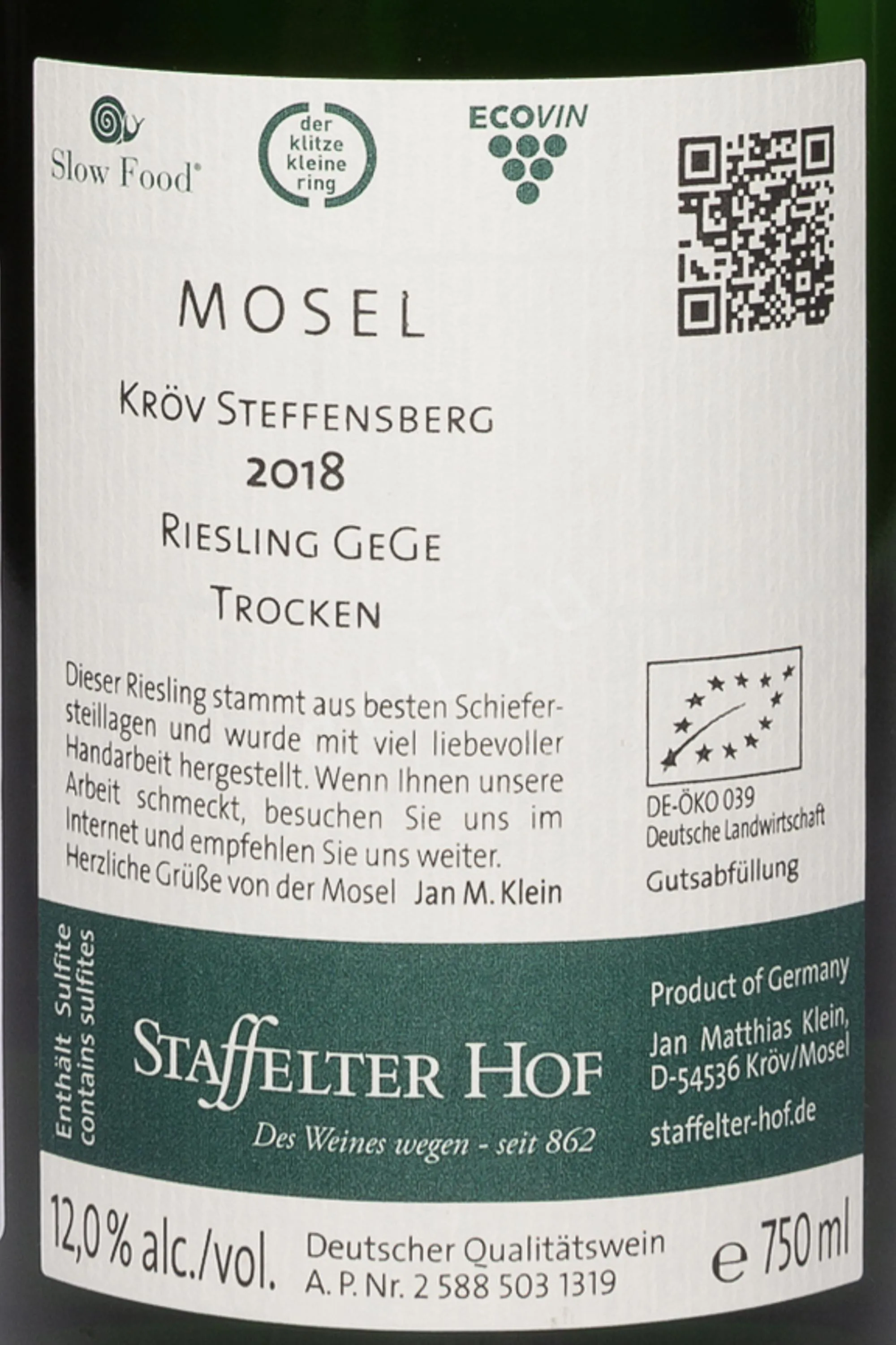 Белое полусухое вино Staffelter Hof Krov Steffensberg GeGe Riesling Trocken 2018 0,75 л отличается благородством характера, свежестью и выразительностью вкуса. Виноград сорта Рислинг выращивают в регионе Мозель на крутых склонах виноградника Штеффенсберг, который имеет категорию Гран Крю. Он находится в деревне Кров и имеет органический сертификат. Почва террас сланцевая, благодаря чему вино обладает яркой минеральностью. Урожай собирают вручную. Ферментация проходит при контролируемой температуре в стальных ёмкостях, выдержка — в дубовых фудрах для придания объёма и сложности вкусу. Вино дополнительно созревает 4 месяца в бутылке, превращаясь в настоящий шедевр. Оно ярко демонстрирует мастерство винодела Яна Матиаса Кляйна и особенности терруара.