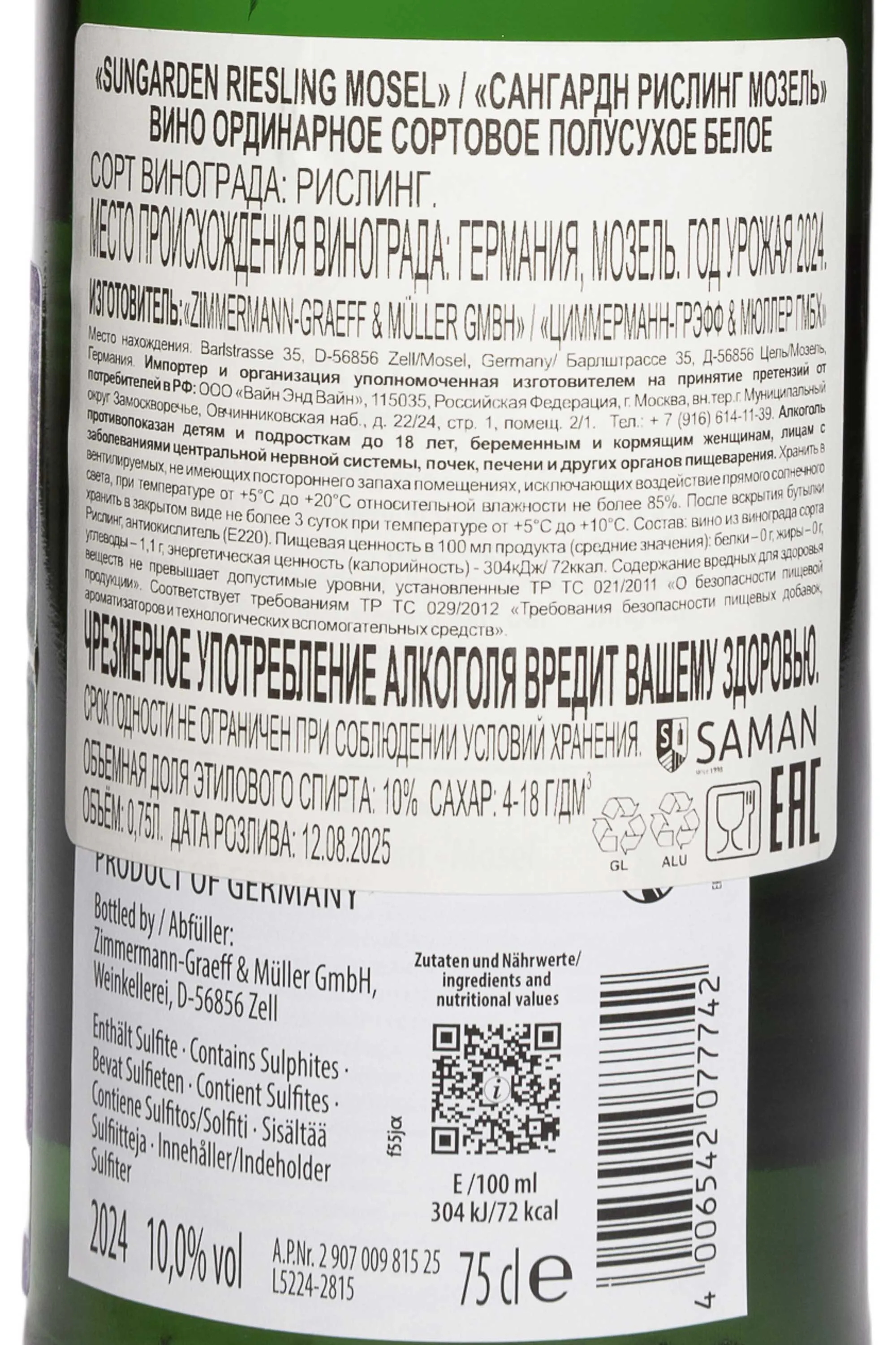 Белое полусухое вино Sungarden Riesling Halbtrocken Mosel 2024 0,75 л — элегантное, с тонкой балансировкой кислинки и свежести, созданное из органического винограда. 2024 год был сложным в плане погодных условий из-за сильной засухи в начале лета и последовавших за ней ливней вплоть до августа. Виноделам пришлось приложить все свое мастерство для создания достойного купажа. Сорт Рислинг был выращен в историческом терруаре Мозеля, где гранитные склоны придают ягодам минеральный оттенок. Ферментация велась при контролируемой температуре, что позволило сохранить фруктовые ноты. Выдержка протекала на осадке до весны, что обогатило вкус и обеспечило кремовую текстуру. Уникальность этого вина заключается в сочетании лёгкой сладости и освежающего послевкусия.