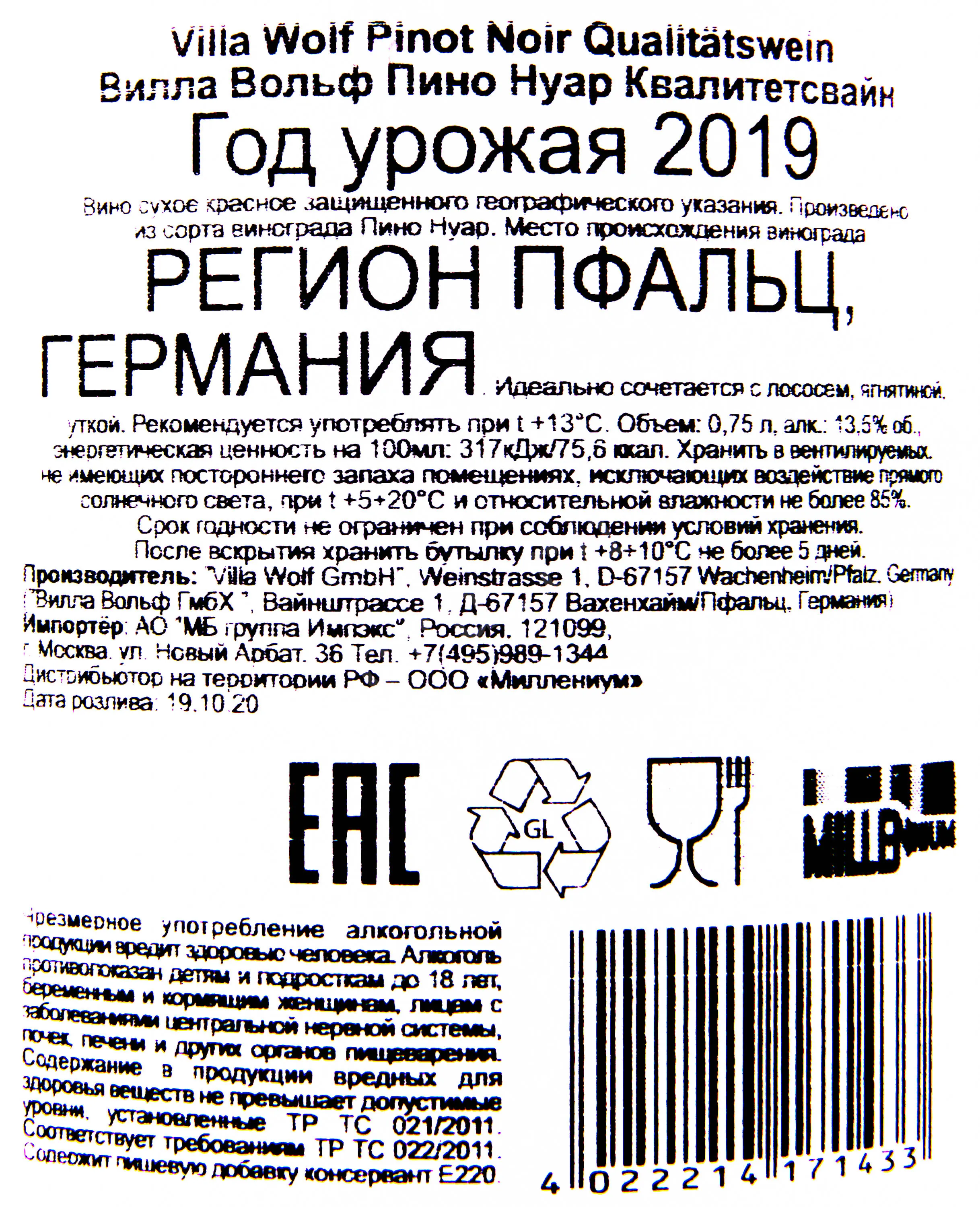 Вилла Вольф Пино Нуар Квалитетсвайн 2019 0.75