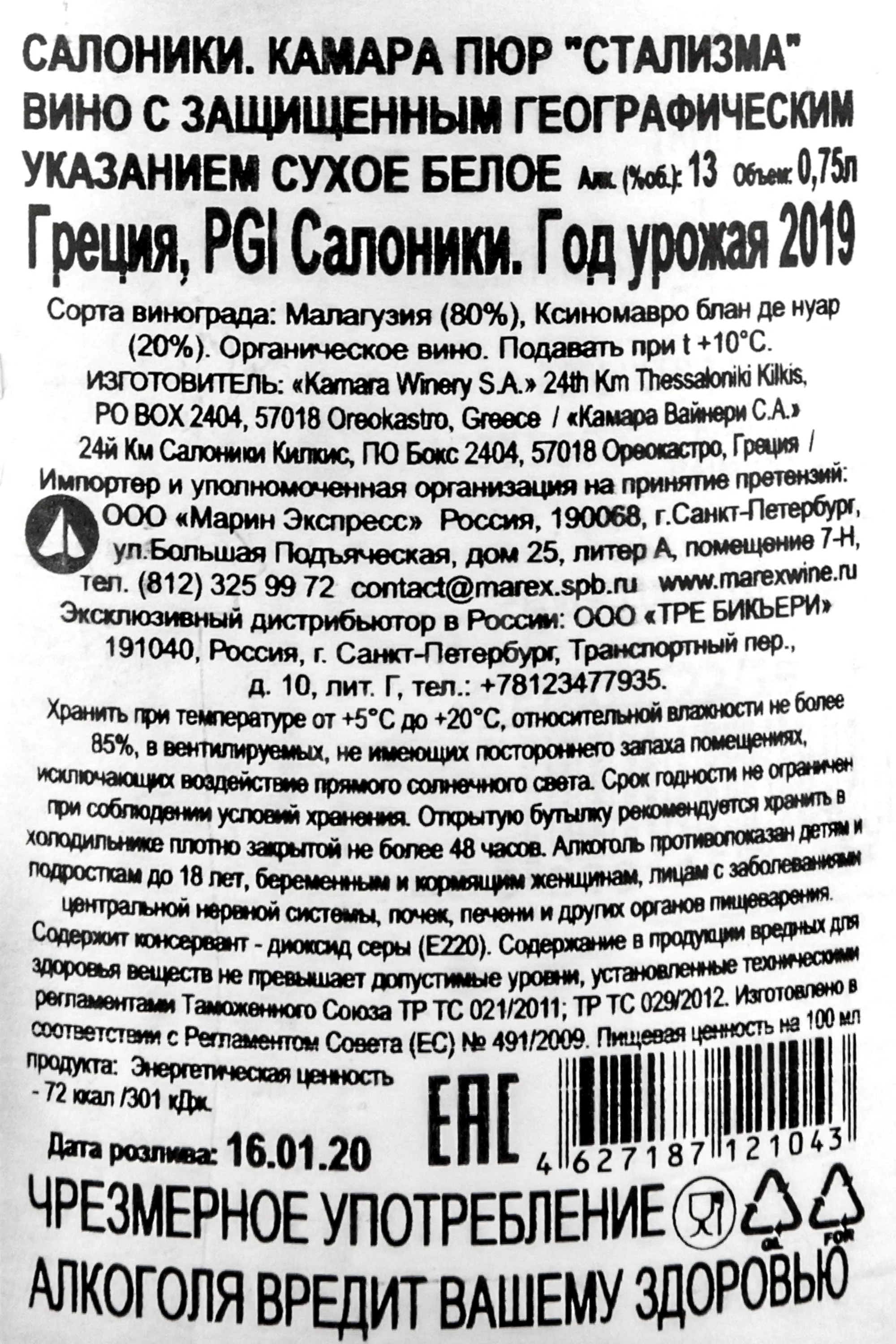 Белое сухое вино Kamara Pure Stalisma 2019 года 0,75 л — натуральное, органическое, обладает собственным стилем. Виноград автохтонных греческих сортов был выращен в регионе Салоники, на виноградниках близ Ореокастро. Терруар характеризуется глинисто-сланцевыми почвами и мягким солнечным микроклиматом. Вино создаётся с минимальным вмешательством в процесс. Ферментация каждого сорта проходит отдельно с природными дрожжами в ёмкостях из нержавеющей стали. Затем вино выдерживается на осадке не менее трёх месяцев и бутилируют без фильтрации и стабилизации. Уникальность Камара Пьюр Стализма подтверждена высокими оценками международных критиков, отмечающих его выразительность, баланс и характерную минеральность.