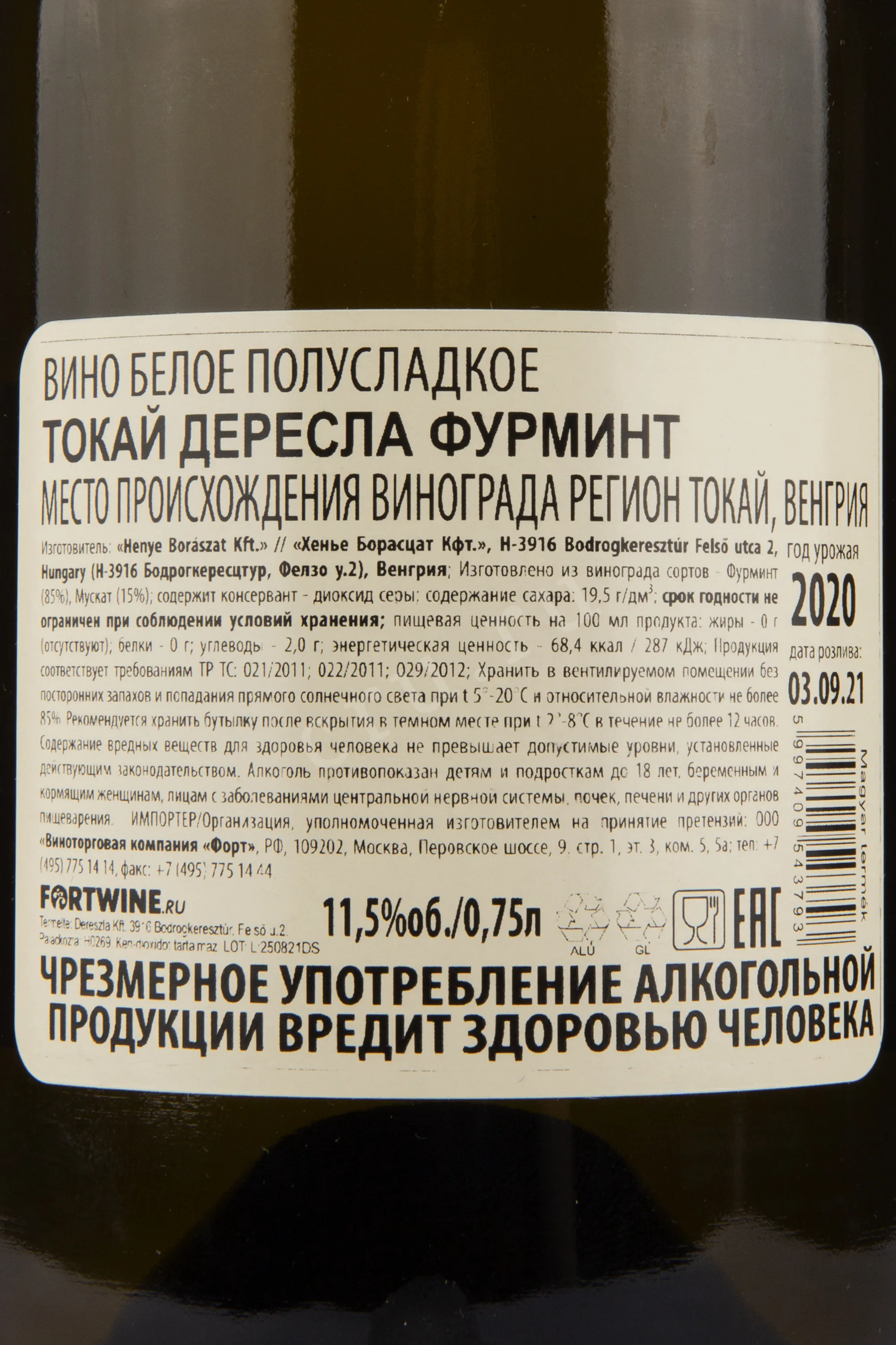 Chateau Dereszla Tokaji Furmint 2020 0.5 л купить - Венгерское вино Шато Дересла Токай Фурминт цена в магазине