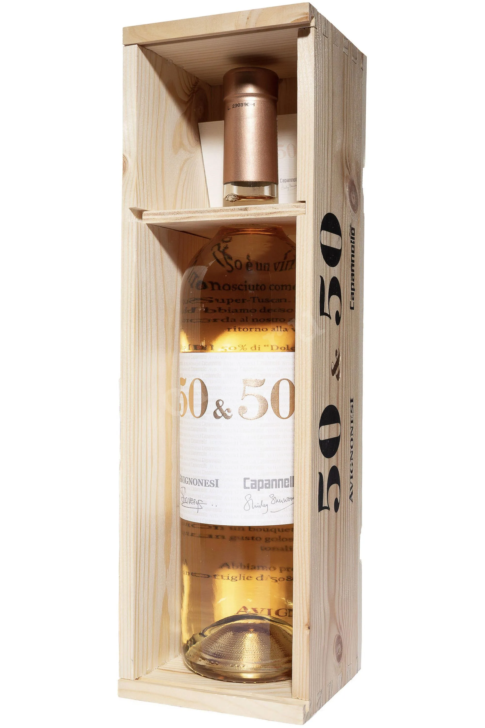 Розовое сухое вино 50 & 50 Avignonesi-Capannelle 2022 г. 0,75 л в подарочной упаковке — интересная новинка, созданная из урожая одного года по классической технологии производства Розе. В состав купажа, традиционно для бренда, вошли два сорта — Санджовезе и Мерло с виноградников двух хозяйств — Капаннелле и Авиньонези, расположенных в разных регионах Тосканы — Кьянти и Монтепульчано. Собранный вручную виноград отделили от веточек и прессовали, сусло настаивали несколько часов на мезге для окрашивания, затем слили с осадка и ферментировали в стальных емкостях при постоянном контроле температурного режима. Вино выдерживалось 4 месяца в стали. Вариация в подарочном деревянном ящичке как нельзя лучше подойдет на роль изысканного презента.